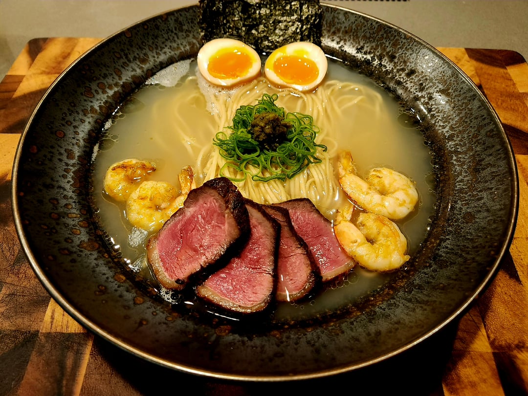 Here's the ramen of the day. I wanted to try something bit different and it was surprisingly good. So we have a chicken/dashi soup, a sake shio tare and a caramelised onion oil. For toppings it was picanha (from what I believe is the best beef producer in the country), some tiger prawns, Sapporo style noodles, the usual egg, spring onions and some yuzu kosho that I made earlier this year as I thought it'd work well with the whole surf and turf!