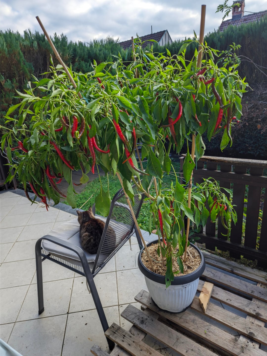 Chair for support as the pot is no longer heavy enough to hold it up, and cat for guarding.