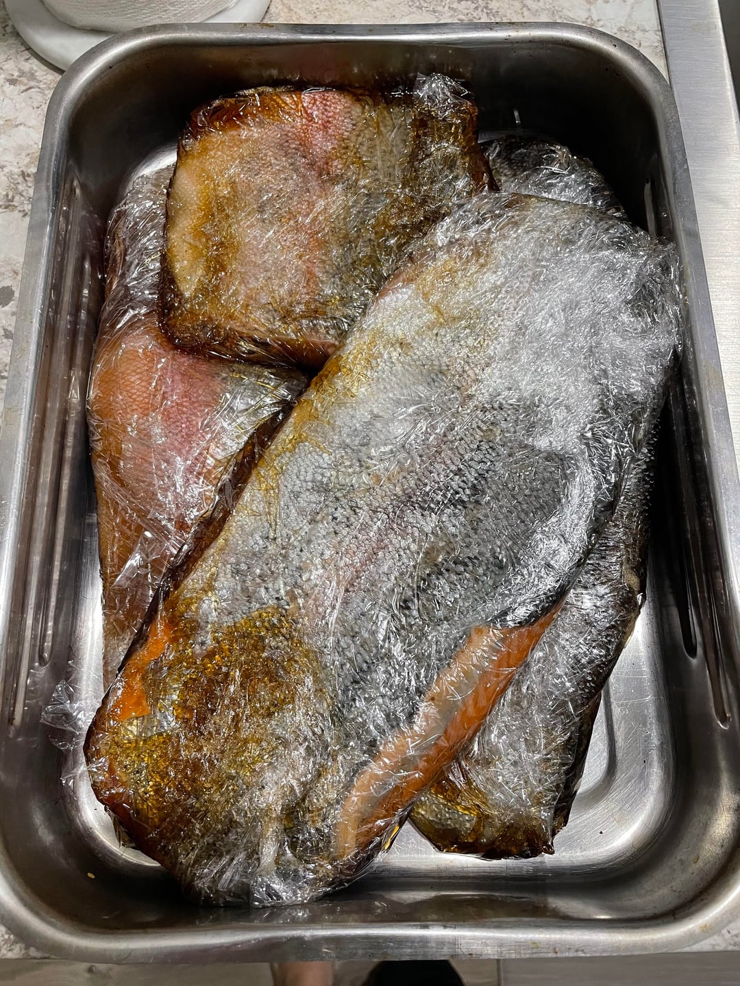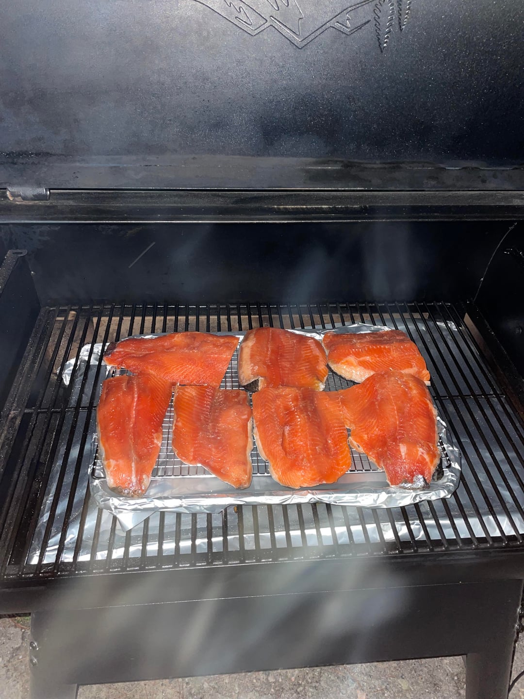 Had some rainbow in the freezer, did a 12 hour dry brine and smoked above 155 for a firmer texture. Brushed with maple syrup and honey.