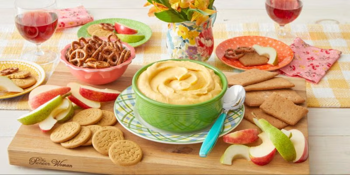Canned pumpkin, cream cheese, whipped cream, and seasonal spices all work together to create a sweet, dreamy, velvety-smooth spread that tastes like a mix between icing and pumpkin pie filling. Pair this festive dip with apple slices, graham crackers, or pretzel rods to get your sugar fix before loading up on pie!
