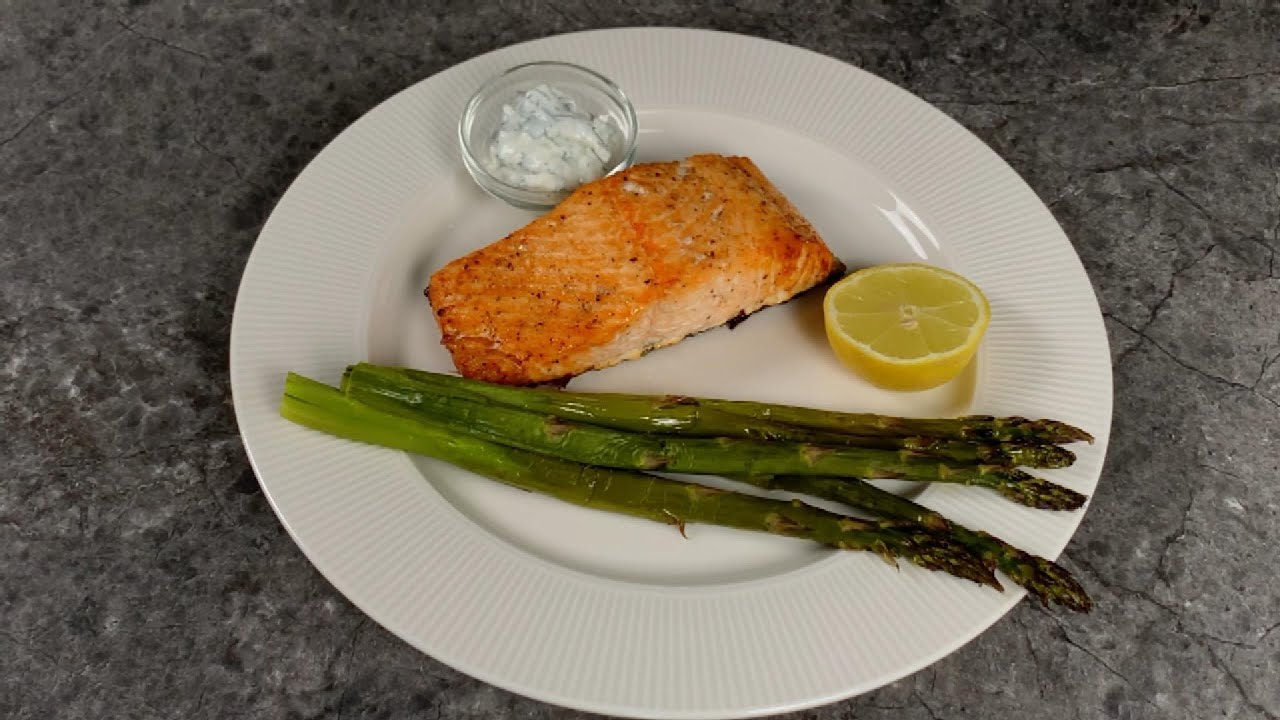 Welcome to my channel. Today we’re going to make a very easy and tasty dish that you can easily recreate. Take some parchment paper and place a piece of salmon on it — about 200 grams per serving. Sprinkle with salt and freshly ground pepper. Drizzle with a little olive oil. Place it on a baking tray and bake in the oven for 10 minutes at 180°C / 356°F. While the salmon is baking, let’s prepare the asparagus. Trim the tough ends and peel off the hard outer layer with a knife or vegetable peeler. Take the salmon out of the oven and place the asparagus next to it. Drizzle a little olive oil over the asparagus. Bake again for 5–7 more minutes. Now let’s make the sauce. Finely chop some fresh parsley and dill. Put the herbs in a bowl and press in one clove of garlic. Add salt, pepper, and plain yogurt. Mix everything well — the sauce is ready! Place the cooked salmon and asparagus on a plate and serve with the sauce. Enjoy your meal!