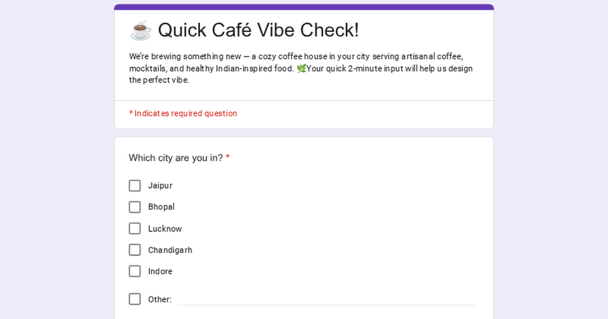 We’re brewing something new — a cozy coffee house in your city serving artisanal coffee, mocktails, and healthy Indian-inspired food. 🌿Your quick 2-minute input will help us design the perfect vibe.by Tasty-Breadfruit-468 Dining and Cooking