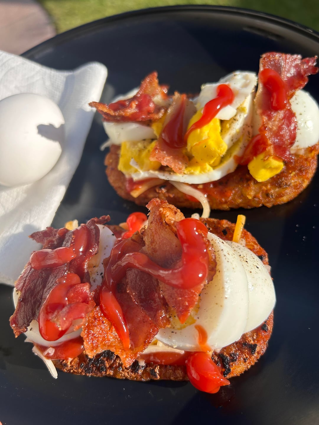 Made some boiled eggs two hash browns bacon and in theory this looked better in my brain as a pick up and eat. buuuut I feel like it’s more for presentation. Then eating with fork after haha. The hashbrown kinda fell apart after first bite. Also for all those who hated on my paper plates used a plastic plate haha.