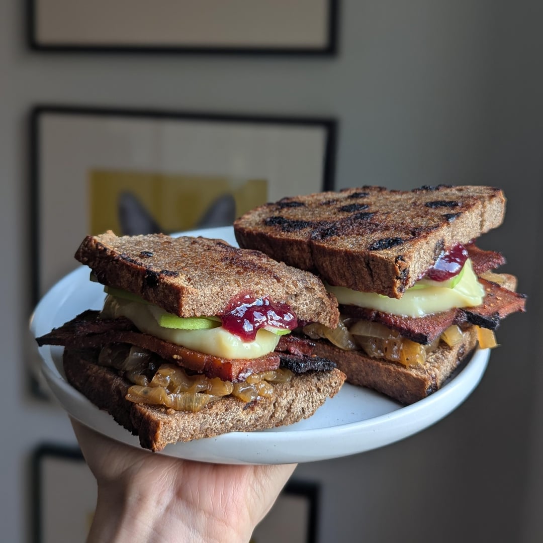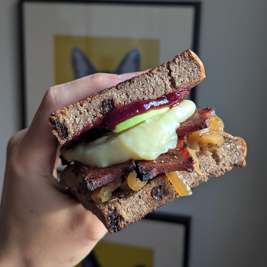 Local vegan restaurant had one, years ago with pesto, Granny Smith apples and melted vegan cheddar. So good. Is that olive bread?
