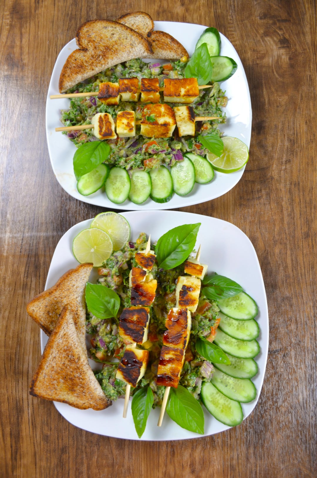 - Serve the grilled halloum with the avocado salsa and grilled bread.