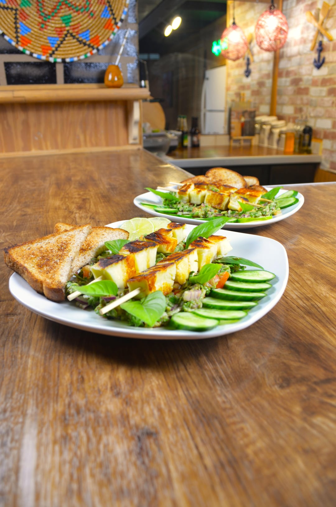 - Cut the halloum into evenly sized cubes and thread them onto skewers.