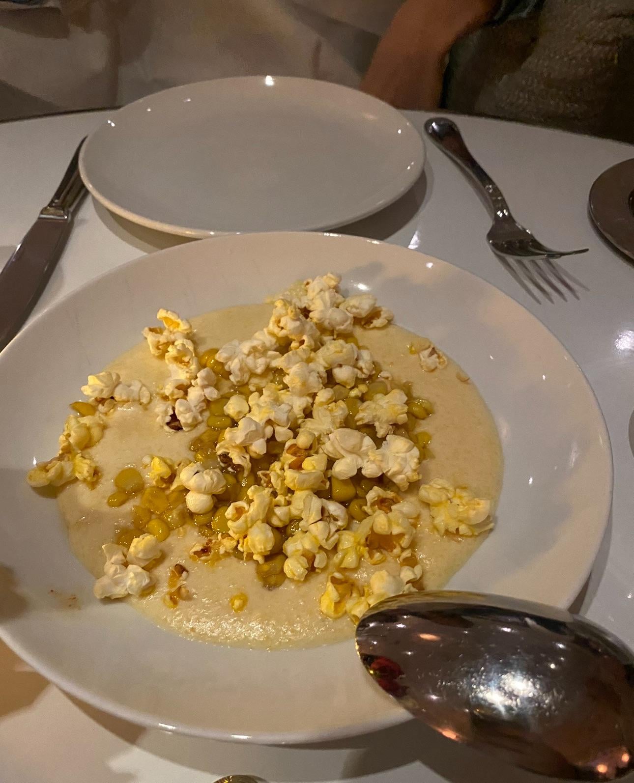 Edit – this was from 2/15/2020. I just googled the menu and the name of the dish was “Corn Corn Corn” creamy polenta, brown butter, popcorn $15.