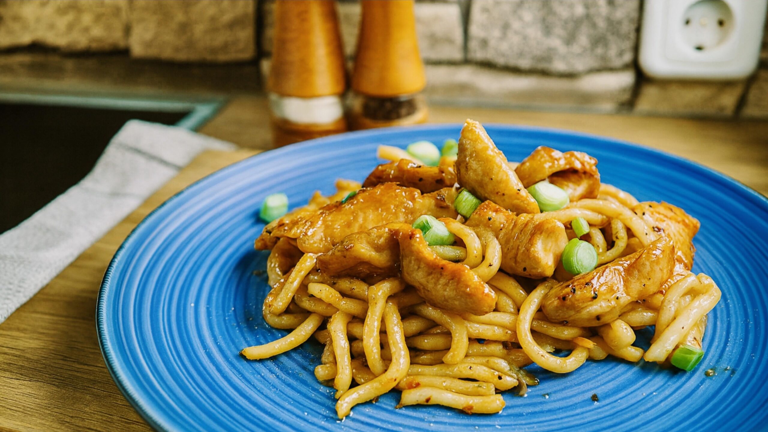 * 500 g chicken breast * 3 garlic cloves * 3 tbsp hot honey * 3 tbsp apple cider vinegar * 1 tsp Worcestershire sauce * 1 spring onion * Udon noodles * Salt, pepper, olive oil