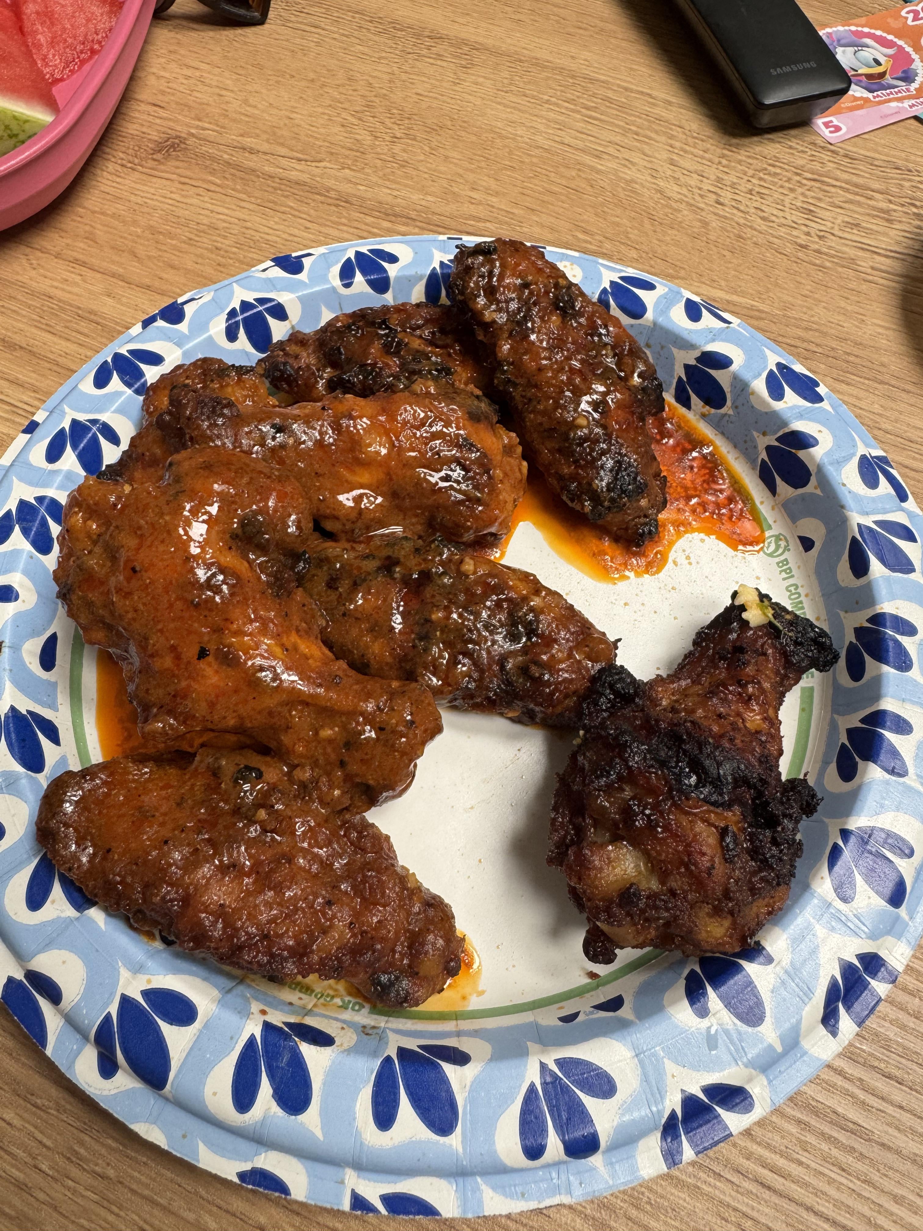 I grilled these wings for about 30-45 min on the grill for low-medium ~350 degrees and they came out so amazing. For the buffalo, I used my own custom version of the Anchor Bar Wings recipe with extra garlic and Tabasco. I used the packet Franks Buffalo dry seasoning for the Buffalo dry rub and a custom mix of brown sugar and seasonings for the dry rub. Honestly the dry rub might of came out better than the Buffalo. My wife who normally isn’t into wings said she would try one and ended up having like 7. Might be my new go to wing recipe outside of regular fried crispy wings!