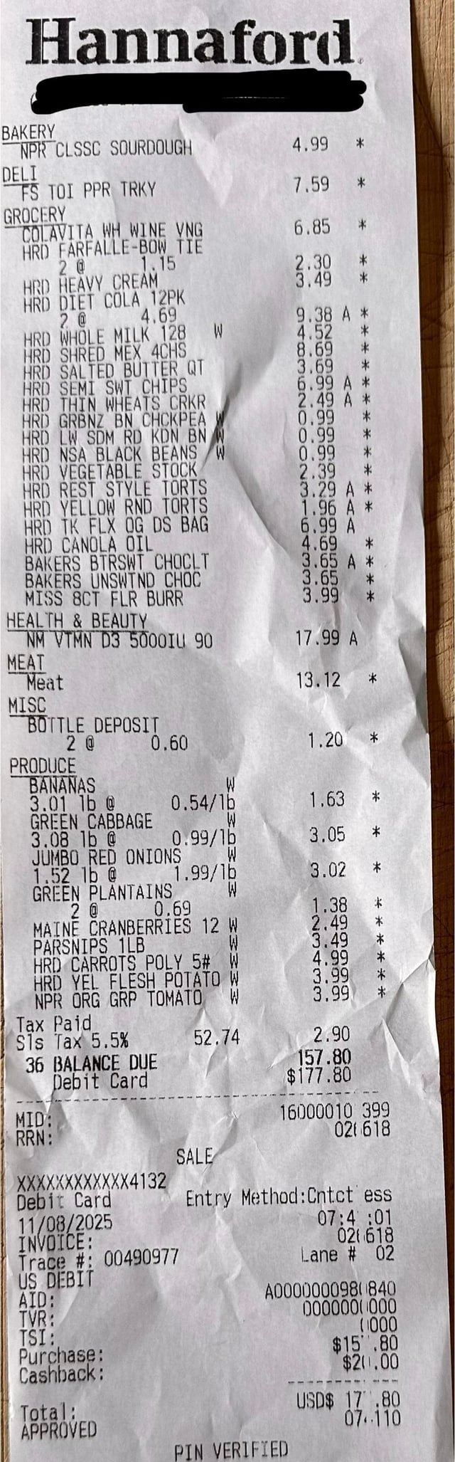 After removing trash bags, cash back and vitamins, the grocery bill this week came out to 132.82, which I am very proud of!