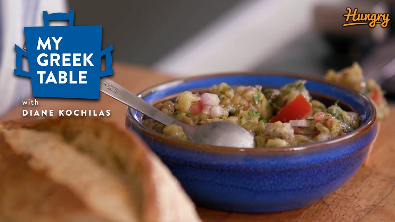 ROASTING MY LAST EGGPLANT HERE. WHEN YOU ROAST THE EGGPLANT ON AN OPEN FLAME LIKE THIS, YOU GET A REALLY BEAUTIFUL SMOKY FLAVOR, AND THAT’S WHAT WE WANT. I’M MAKING A ROASTED EGGPLANT SALAD FROM SANTORINI, WHERE ELSE? THE WAY, I LIKE TO CLEAN THE EGGPLANT IS OPEN IT UP, AND TRY TO BUTTERFLY IT A BIT. JUST SCORE THIS A LITTLE BIT. THAT HELPS THE PULP COME OUT VERY EASILY. WANT TO GET A LITTLE BIT OF OLIVE OIL IN THE BOWL. CLEAN OUT MY PULP HERE, AND DRESS THIS UP SANTORINI STYLE. ♪♪ LET ME SHOW YOU MY AWESOME GREEK TECHNIQUE HERE. MOST PEOPLE WOULD BE INCLINED TO CHOP THE EGGPLANT FIRST. BUT WE PUT THE EGGPLANT PULP IN HERE, AND CHOP IT RIGHT IN THE BOWL WITH A FORK AND KNIFE. WHEN THE PULP IS WARM, IT ABSORBS ALL THIS GORGEOUS OLIVE OIL. THE WHOLE IDEA IS TO HAVE SOMETHING THAT’S BOTH CHUNKY, BUT REALLY SOFT AND COMFORTING. I AM GONNA ADD A LITTLE BIT OF SALT, AND I’LL TASTE IT TO SEE IF IT NEEDS SUGAR. LET’S SEE. THAT’S PERFECT. DOESN’T NEED ANYTHING. I JUST WANT TO GET THE SEEDS OUT OF MY TOMATO, AND I’M JUST GONNA DICE THIS NOW. I WANT LITTLE PIECES THAT YOU CAN FEEL. IT’S NOT SUPPOSED TO BE SUPER FINELY CHOPPED. CHOPPED RED ONION. IN GREECE, YOU CAN SORT OF TELL WHERE YOU ARE BY WHAT’S IN THE DISH. SO WE’RE DOING A SANTORINI VERSION, OF COURSE, I’M USING CAPERS. GARLIC. A LITTLE PARSLEY. LOOK AT THAT. ISN’T THAT BEAUTIFUL? THIS LOOKS LIKE A GREEK SUMMER. I’M JUST ADDING A LITTLE BIT OF ACID, GREEK BALSAMIC. YOU NEED ACID IN MOST DISHES. IT HELPS BALANCE OUT ALL THE FLAVORS. IT BRINGS OUT EVERYTHING. ♪♪ MMM, THAT IS SO GOOD. IT’S REALLY CREAMY FROM ALL THE OLIVE OIL AND THE EGGPLANT MIXED TOGETHER. IT’S GOT A REALLY NICE UNDERLYING PUNGENCY FROM THE CAPERS. THIS IS A REALLY GREAT DISH.