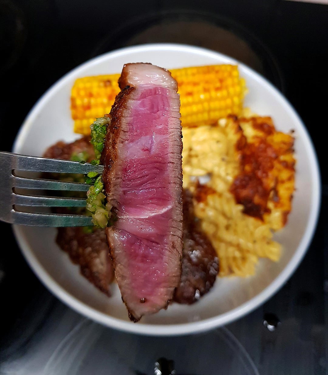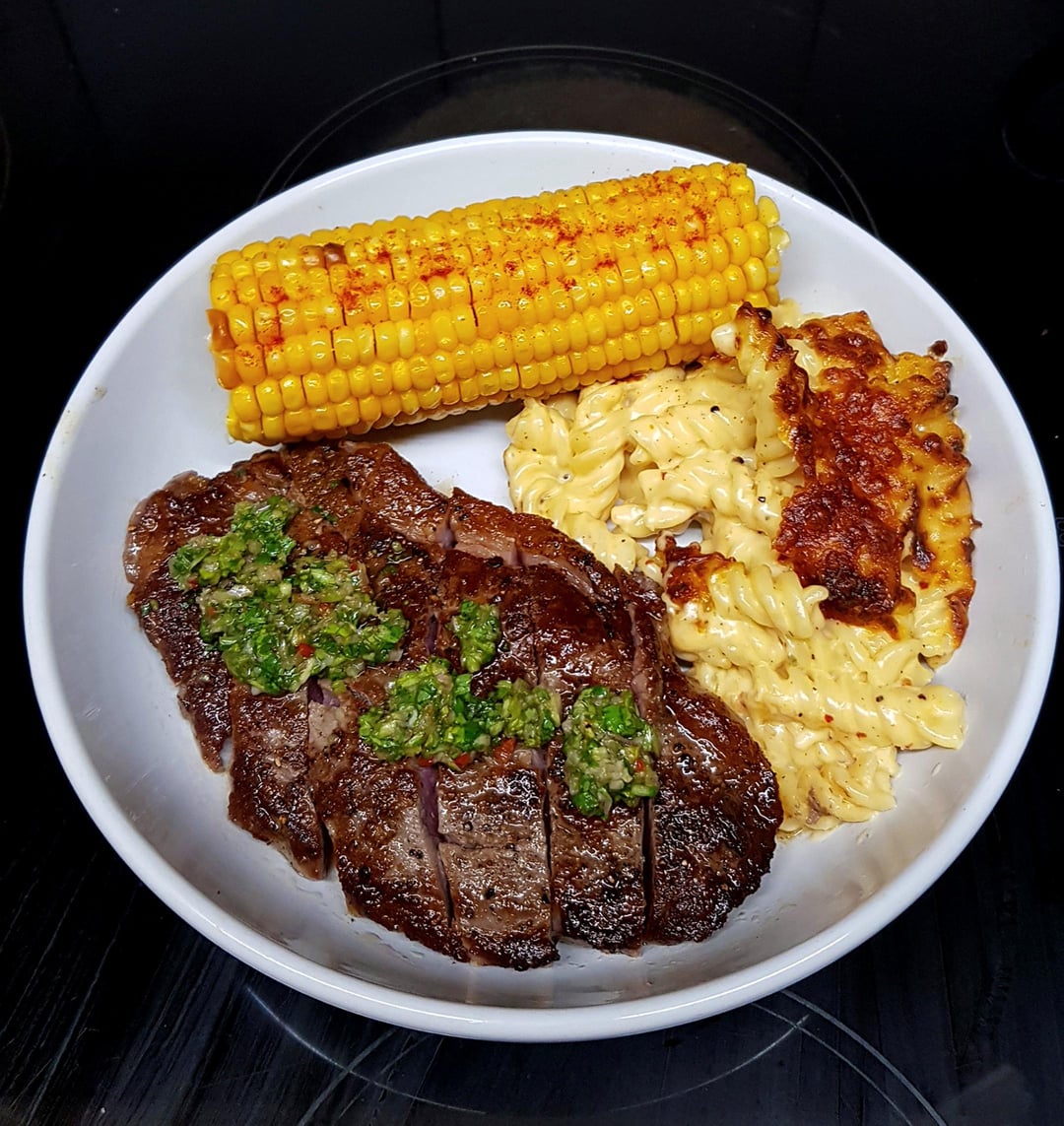 Sirloin Steak with Fresh Coriander Chimichurri, Spicy Mac (Fusilli) ‘n’ Cheese and Corn.by pink_flamingo2003 Dining and Cooking