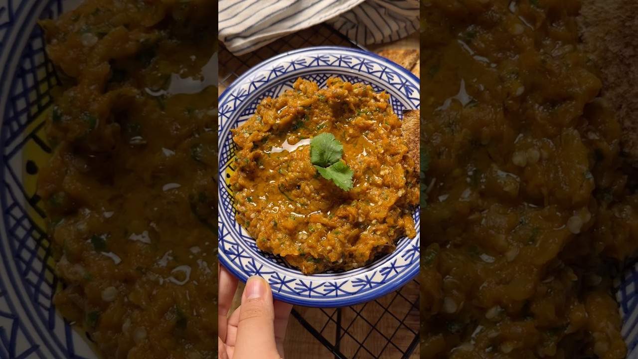 La gastronomía marroquí es considerada de las mejores del mundo, por eso os voy a enseñar a preparar este plato de berenjena llamado SA Look. Lo primero que vamos a hacer es quemarle la piel a la berenjena. Yo lo voy a hacer con un soplete. Lo puedes hacer también en el fuego de la cocina o en el horno, solo que no va a tener ese sabor ahumado. La pelamos y la troceamos hasta que se haga pure. Y por otro lado tenemos una sartén a la que le vamos a echar aceite de oliva y ajo rallado. Lo tostamos muy bien y le añadimos dos tomates rallados. De especias tenemos una cucharadita de pimentón, otra de callena y otra de comino y un poquito de sal. Añadimos nuestro puré de berenjena y lo ponemos a fuego medio lento hasta que se vapore todo el agua y quede una textura así. Y lo último que le vamos a echar es una buena cantidad de perejil y cilantro. Emplatamos. Terminamos por arriba con un buen aceite de oliva y nuestro look que está superlisto.