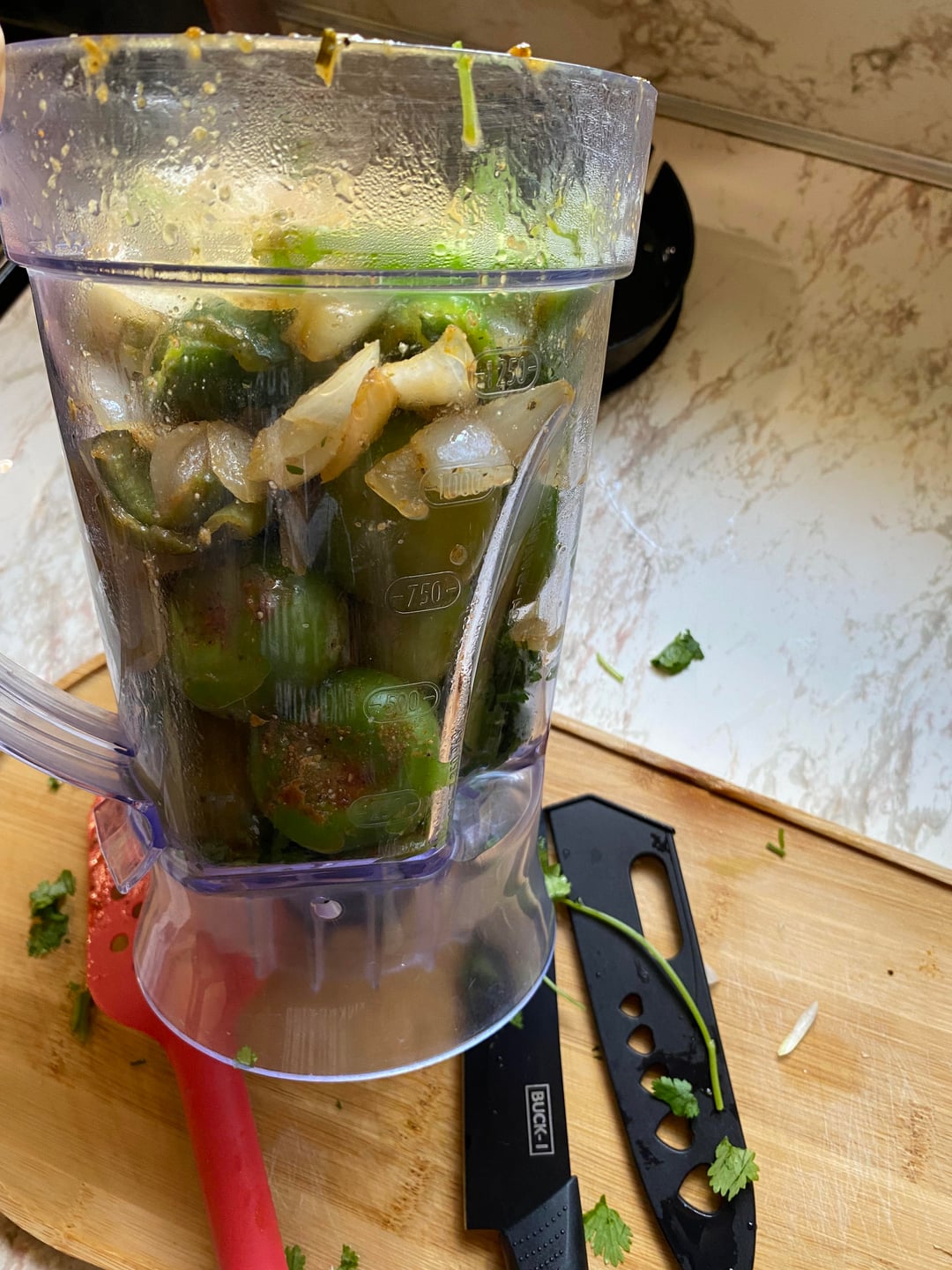 Dump veggies into blender and top with the cilantro bunch