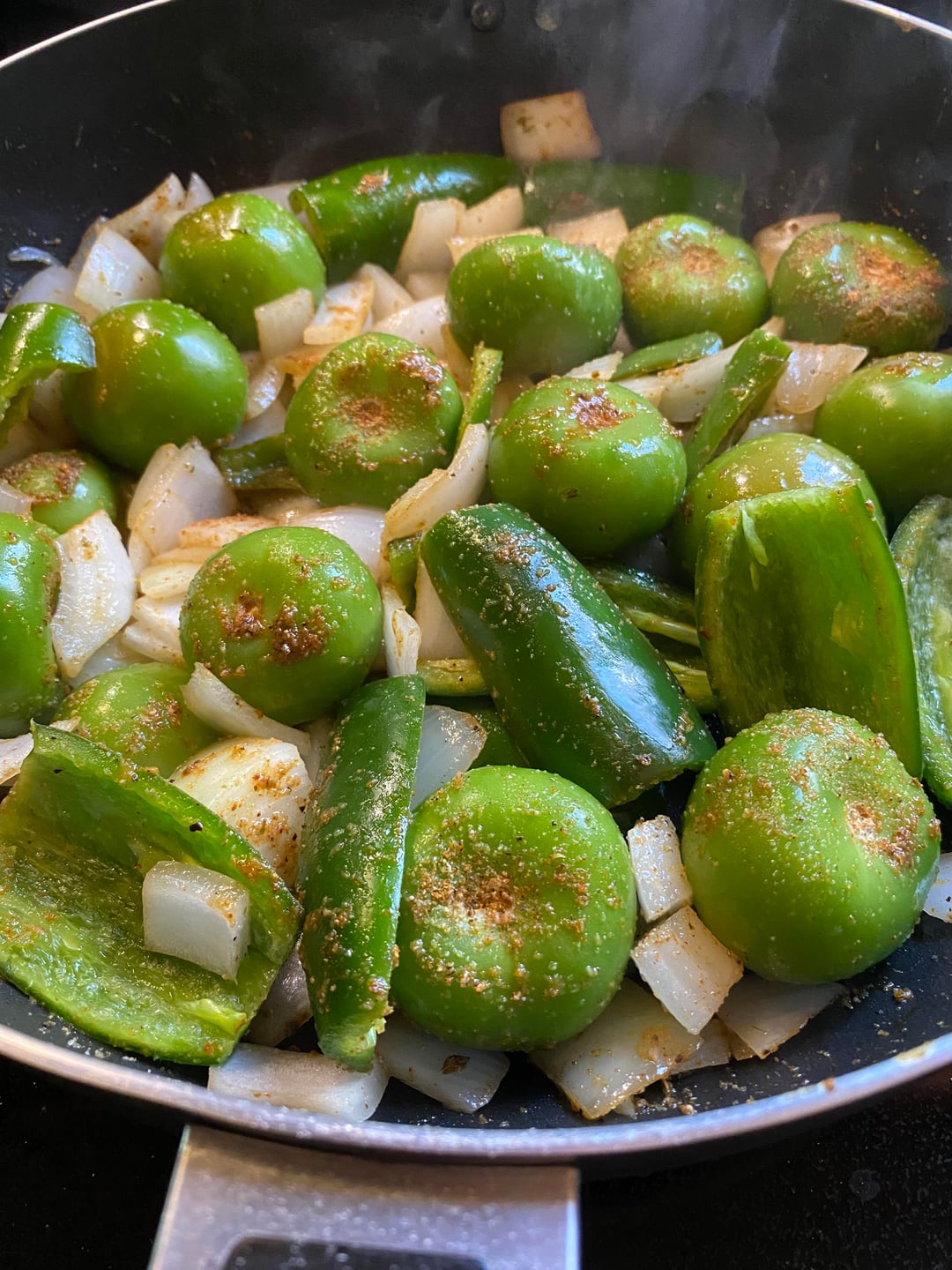Roast peppers and onion on stovetop until blistered on both sides .. (roughly 7-9 min)