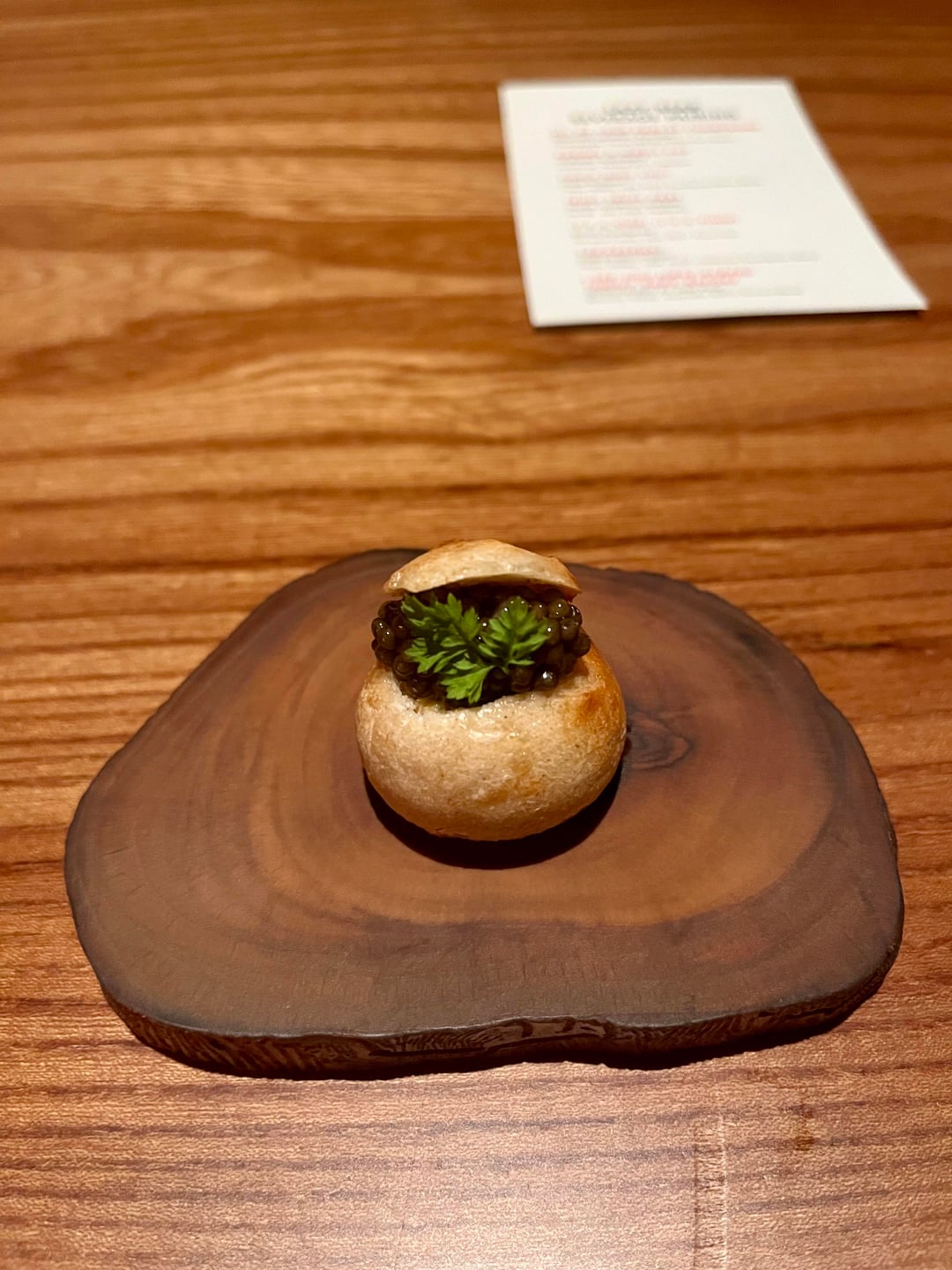 Third was a sourdough pastry with smoked clams and caviar. The starter is a 70 year starter from