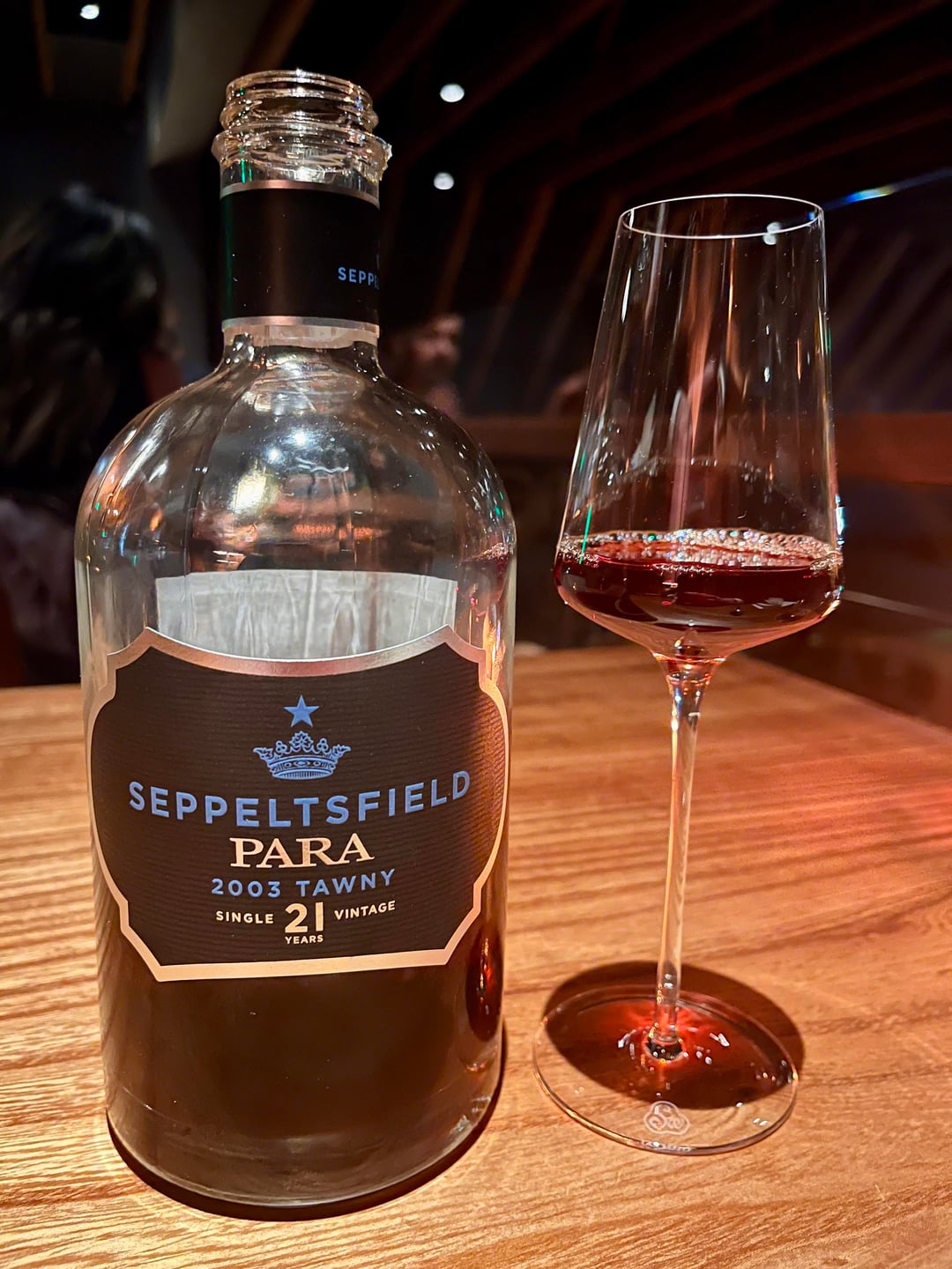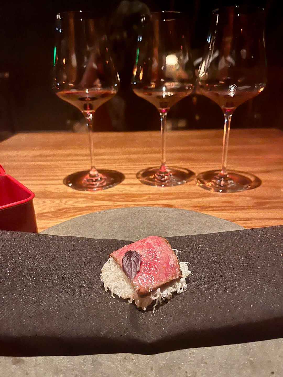 Tenth was wagyu from Miyazaki, a tendon chip “puff” Njuda, smoky tomato and Vella dry jack. Always melt in the mouth of course. Excellent touch of salt. (Then Jaxson hit me with the next blind. I had the right region and was within 5 years on the age but not the right bank here. )