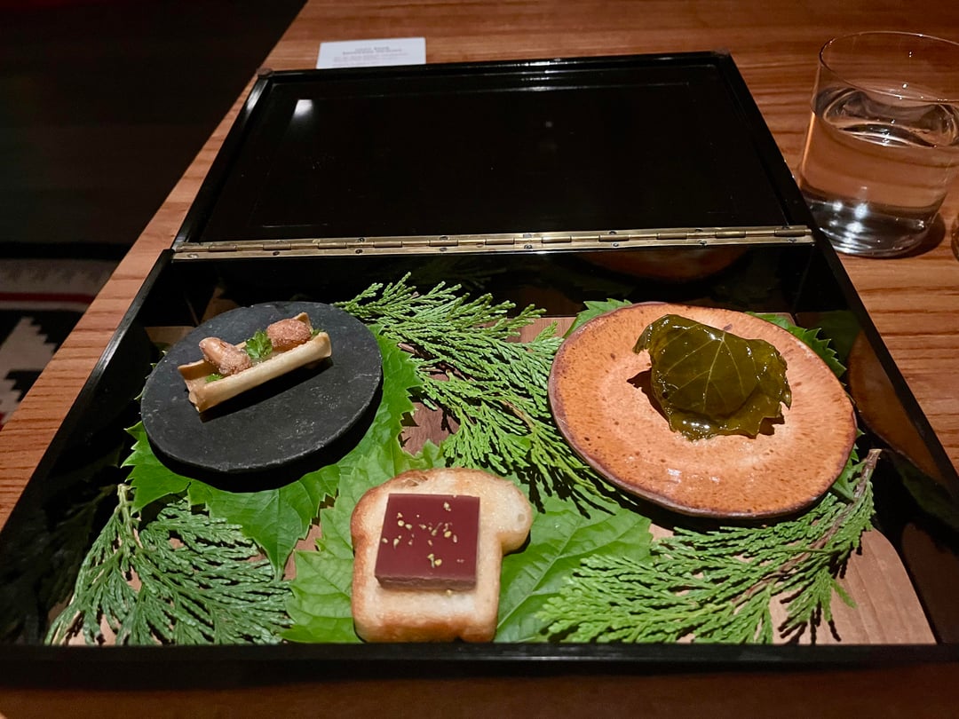 Fifth was “Duck Box” with a theme of PB&J. Duck liver sando toasted in duck fat with grape gel, ants on a log with celery tuile and peanut miso, and a grape leaf stuffed with duck confit and raisins. The tuile was very interesting, adding a rigidity to the dish and the theme came through as interesting interplay of peanut butter and grape accents.