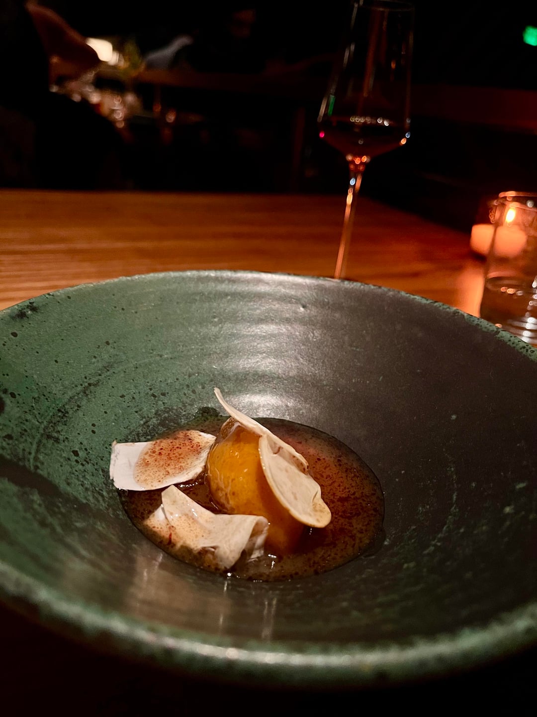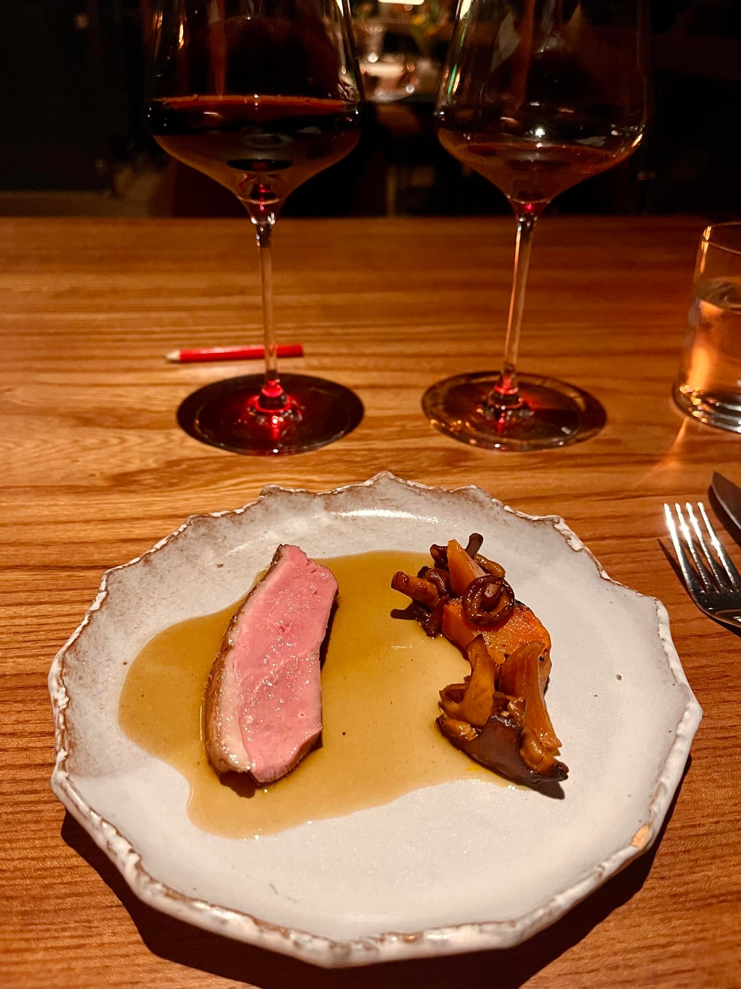 Ninth was liberty duck with chanterelle mushrooms, persimmon, and carrot. Mixture of roasted and dry aged. Lots of umami on this one and the texture on the duck was great. A crispy skin could have elevated though. (This is when Jaxson blinded me. I guessed the right region but the vibrancy of the wine had me off by a decade. This one has aged with great potency. )