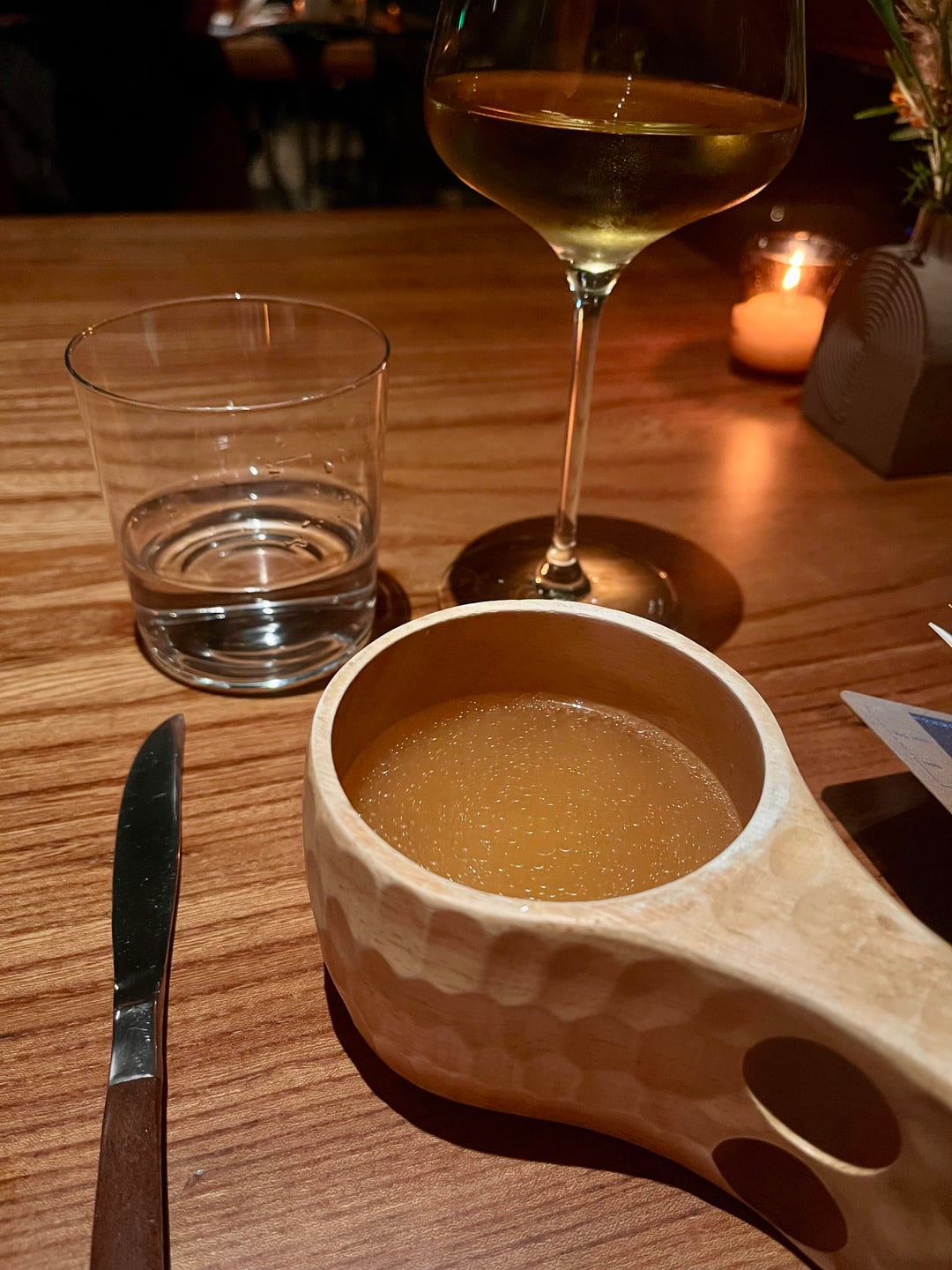 First course was a foraged herbal tea with local honey. Interesting way to do a palate cleanse.