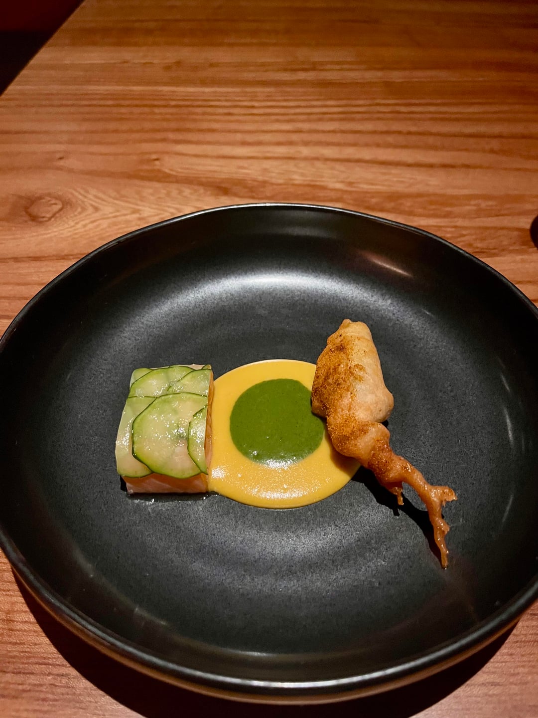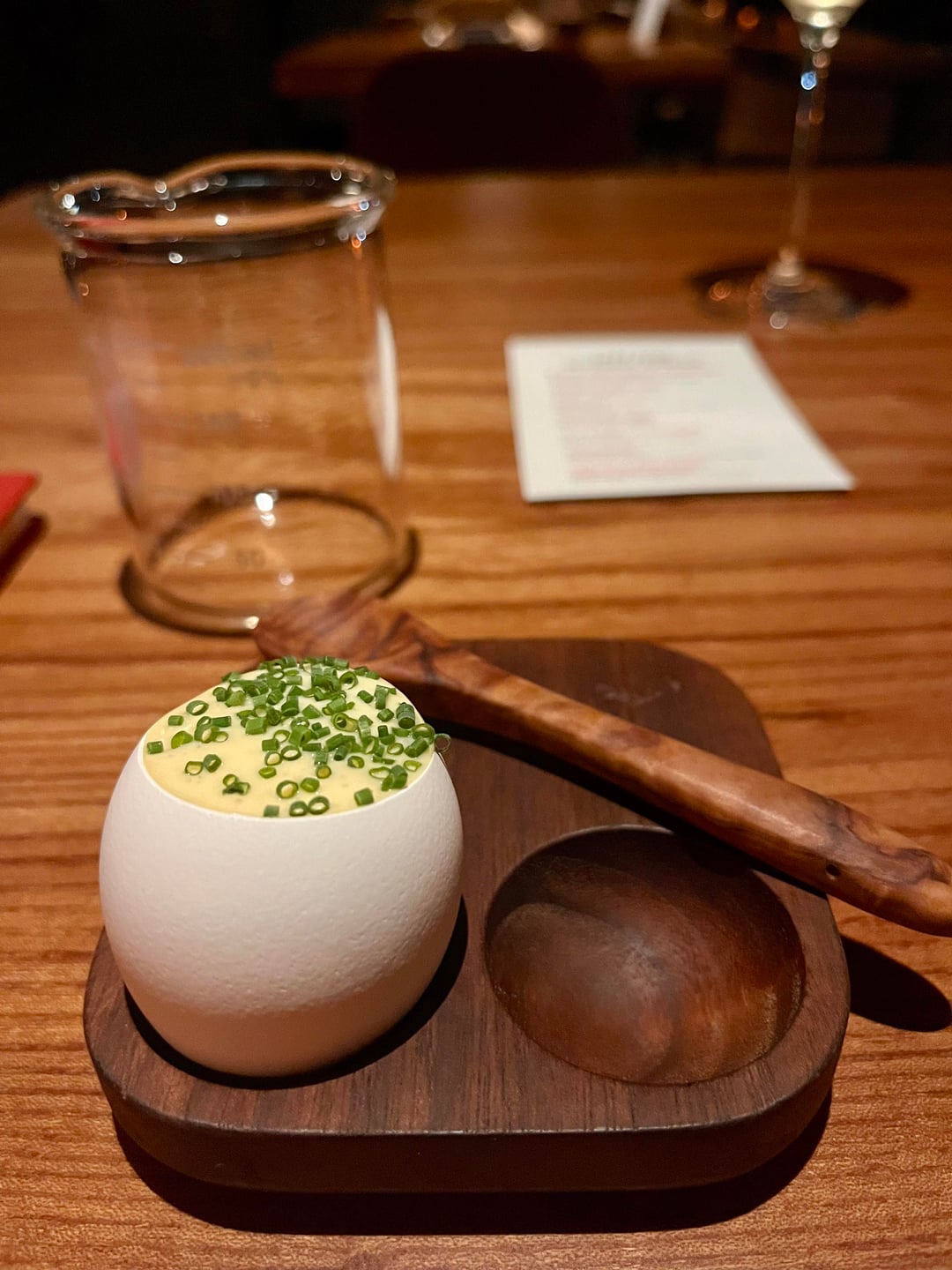 Second was a whipped egg and maple emulsion / foam with a layer of hot sauce at bottom. Evolution was good, a little solidity would have helped the course I think. (Jaxon poured a little Bille, they affectionately call this one “sus boys”)
