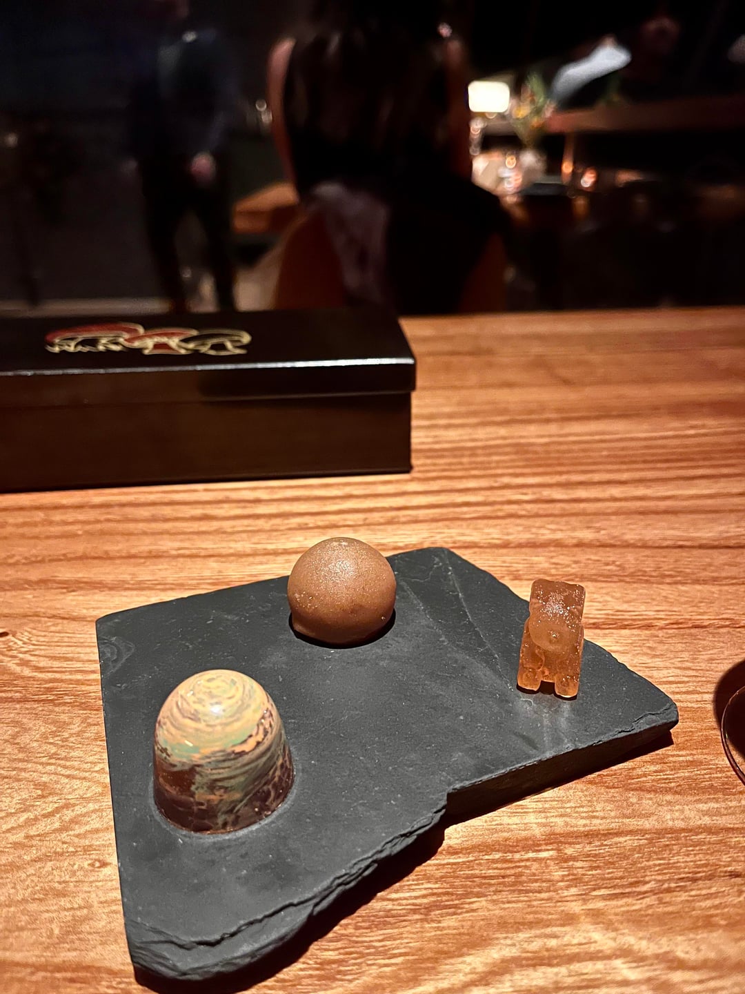 Last was a chocolate bon bon of dandelion brand chocolate with Valencia orange, a truffle made to inspire “pecan pie”, and a cardamom gummy bear. Favorite was the bon bon due to texture and the orange presence.