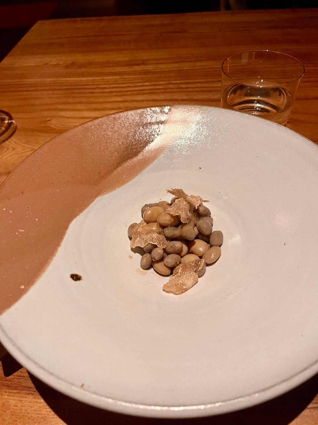 Eighth was fresh shelling beans with onion and alba truffle. They pour this one out of a custom can of beans and shave truffle on it in front of you. Fun serving process but as you can see doesn’t end up looking excellent on the plate.