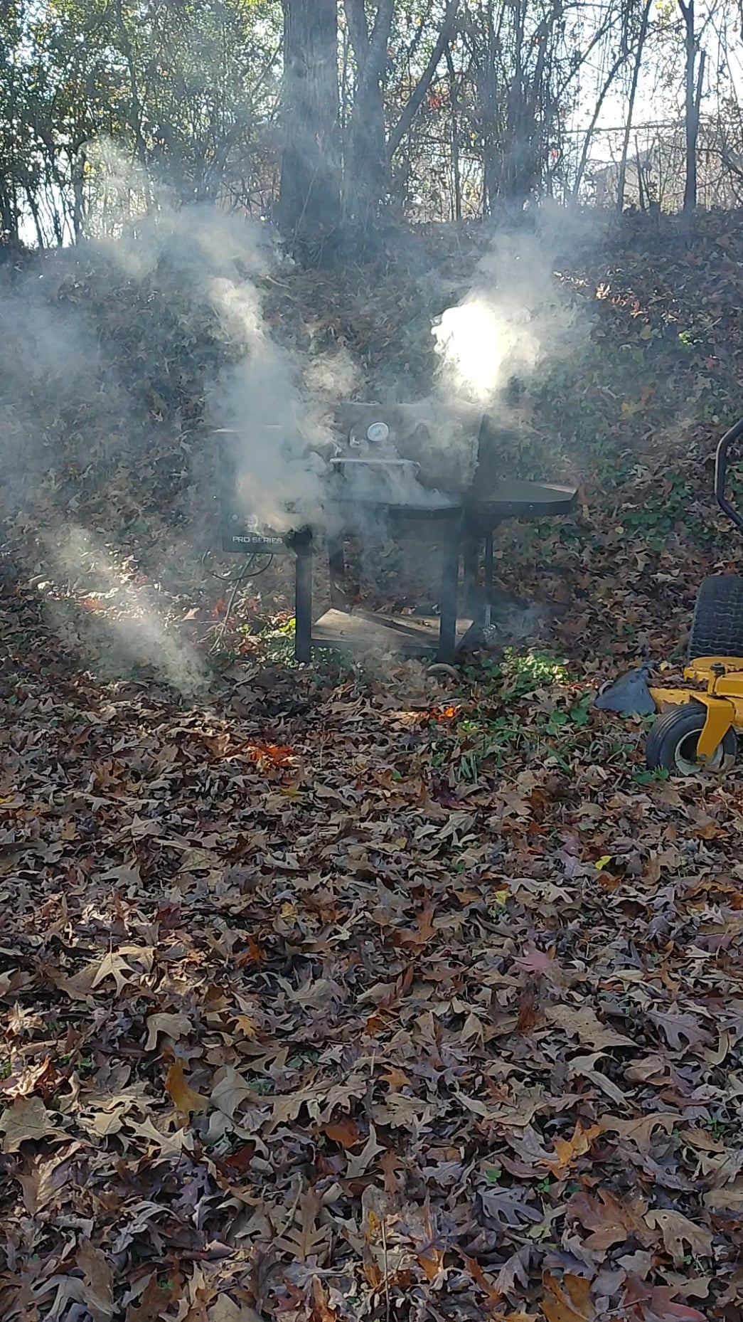 Hey buddy, do me a favor and rake a spot for this bad boy to sit on. Just get the leaves out from under it. Perhaps laying down a tarp directly under or ground cover would be a good idea. Last thing you want is for an errant spark to ruin a perfectly good cook. Happy smoking!