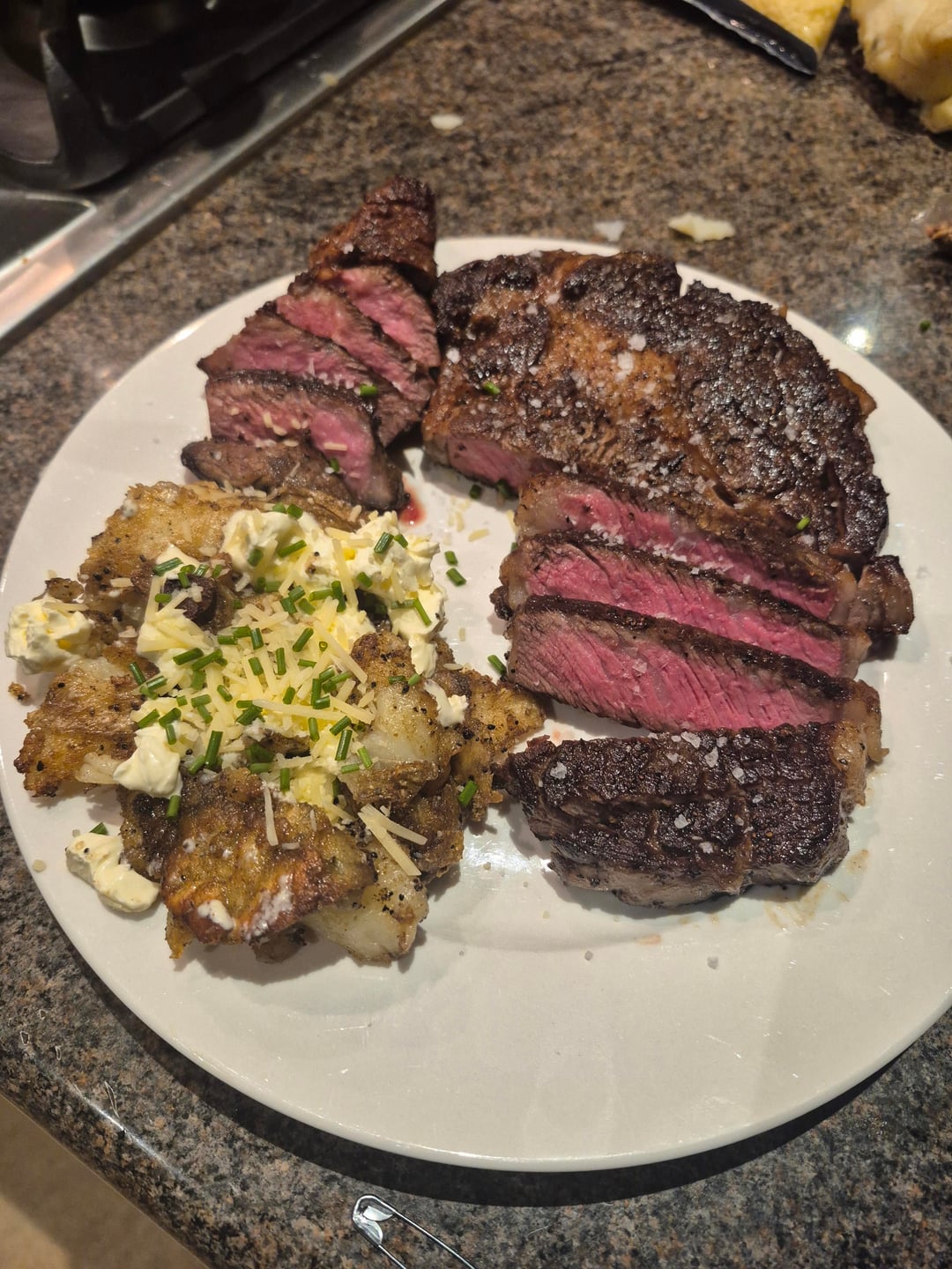 Rib steak, chuck steak, smashed potato. All done in a cast iron pan. Salt, pepper, ghee. Nothing fancy.