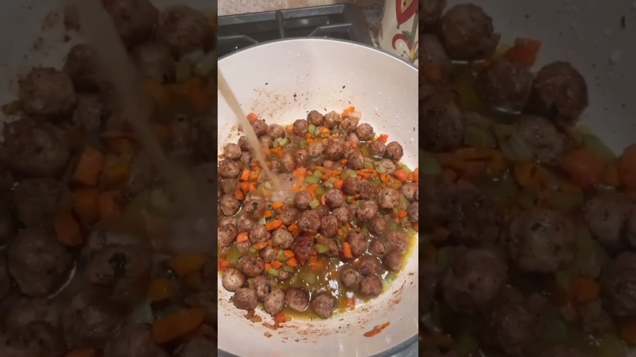 Italian wedding soup. A mill your whole family will love the star mini meatballs. Combine pork and beef with breadcrumbs, pecorino, beaten egg, salt, pepper, garlic powder, and parsley. Form into mini meatballs and then brown them in a pan with olive oil in small batches. Then saute carrots, celery, and onions. Season with salt and pepper and get those cute mini meatballs back in. Add in some chicken broth and simmer. Get in a pecarina romano cheese end and some fresh spinach. For the soup, I use a china de pepe, but you can use any small pasta you like. Boil it up and serve it with the soup. Topped with grated pecorina romano. So easy and so delicious. Follow for more.