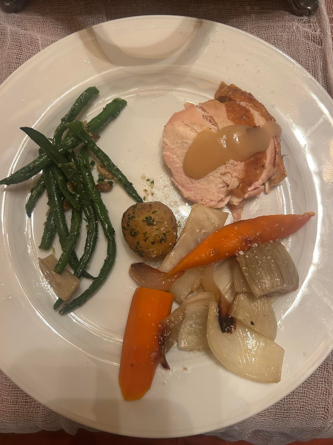 Had these two plates at a friend’s birthday. The veggies were definitely buttery, and there’s pine nuts with the green beans, though not a lot. I would guesstimate it was maybe 5oz chicken? I use a food scale to weigh all my protein at home. I took only white meat chicken but I did eat the skin. Thanks in advance!