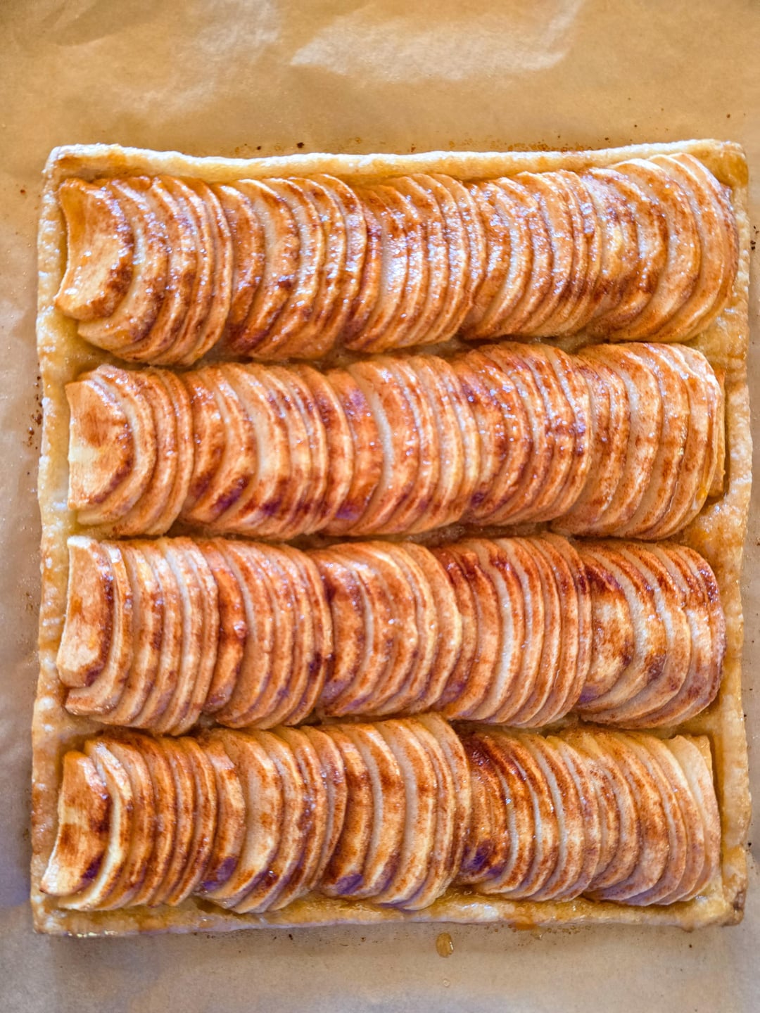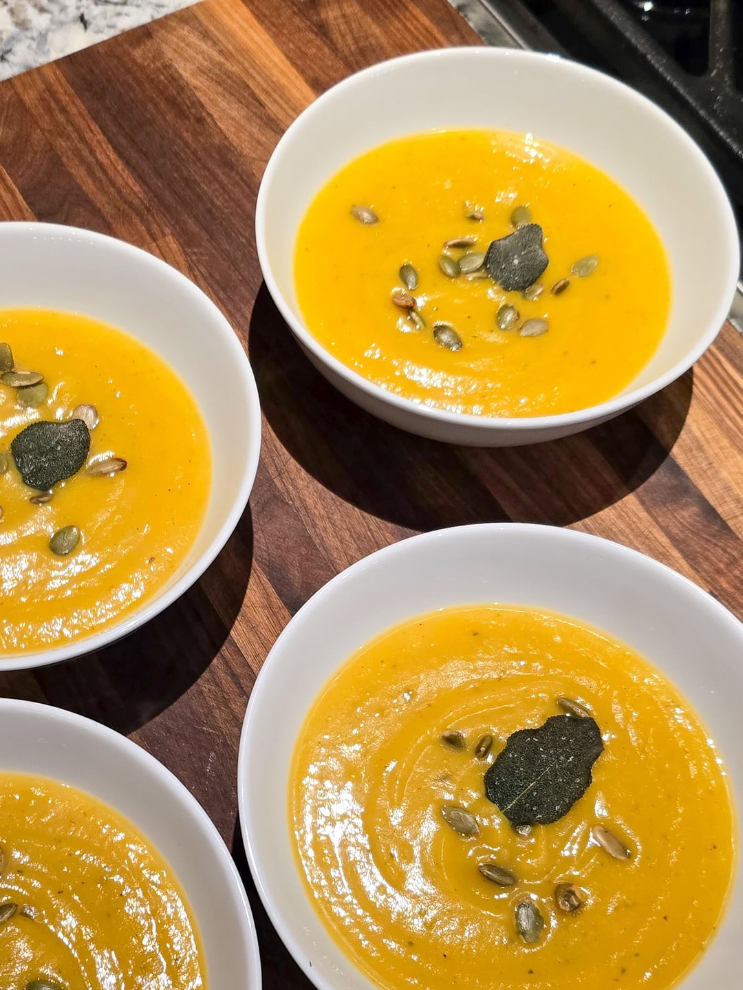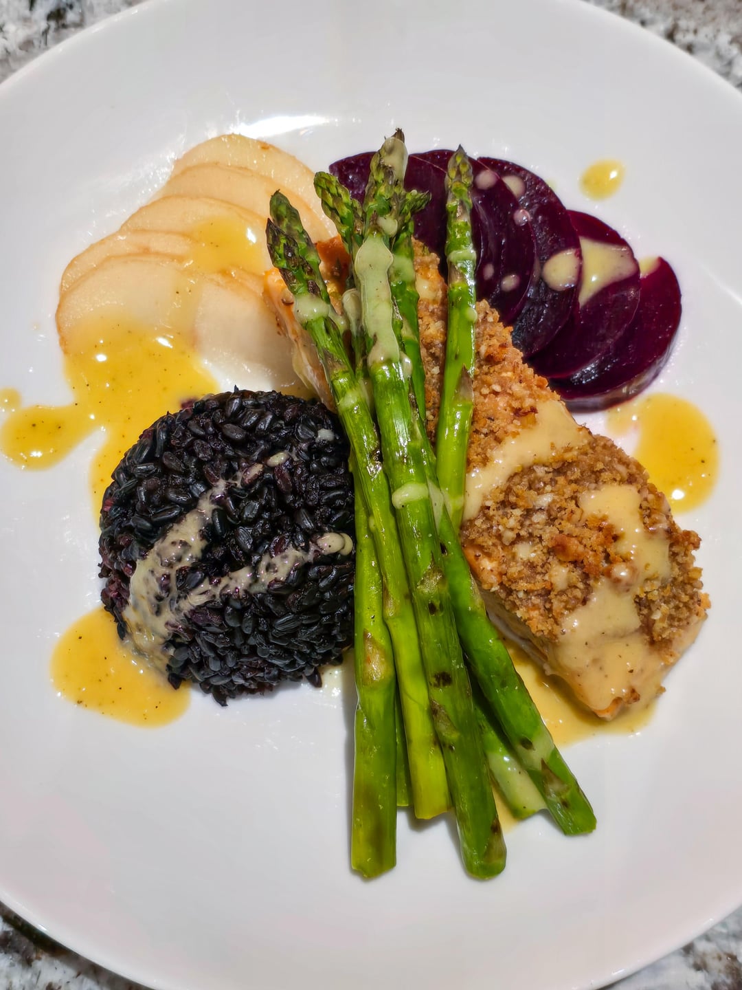 Last night’s dinner party menu: Butternut squash soup, walnut-crusted salmon with shallot dressing, black rice, grilled asparagus, a beet and pear garnish, and puff pastry apple tart for dessert. Nothing was left on the plates!