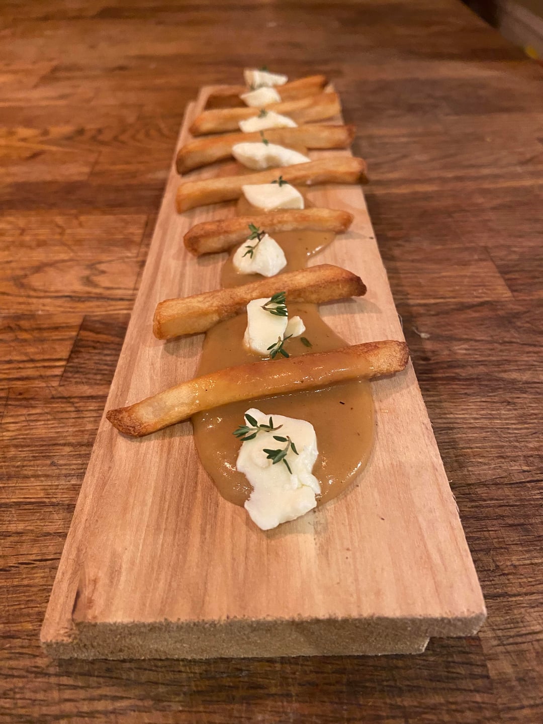 Cold congealed gravy and cold fries on a plank.