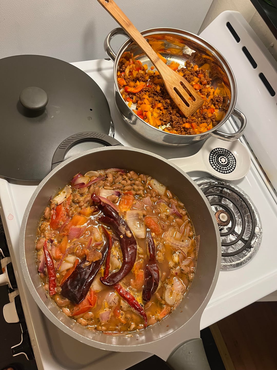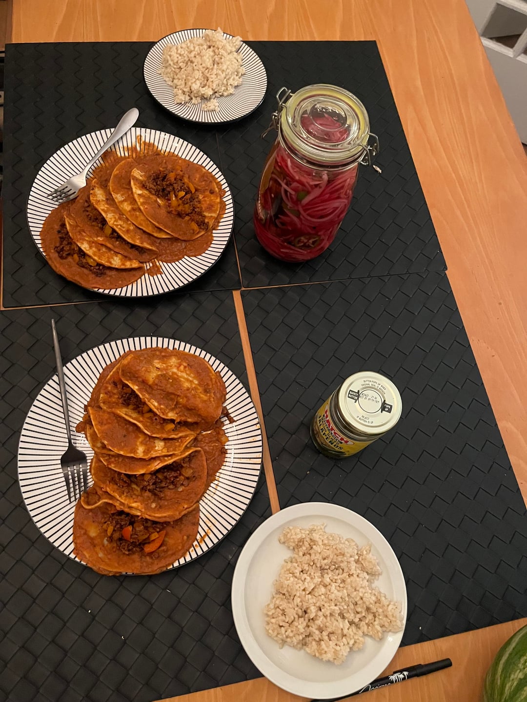All vegan with soyrizo inside. Sauce is pinto beans guajillos arbol tomato onion garlic broth oregano cumin salt pepper blended.by wormgarden Dining and Cooking