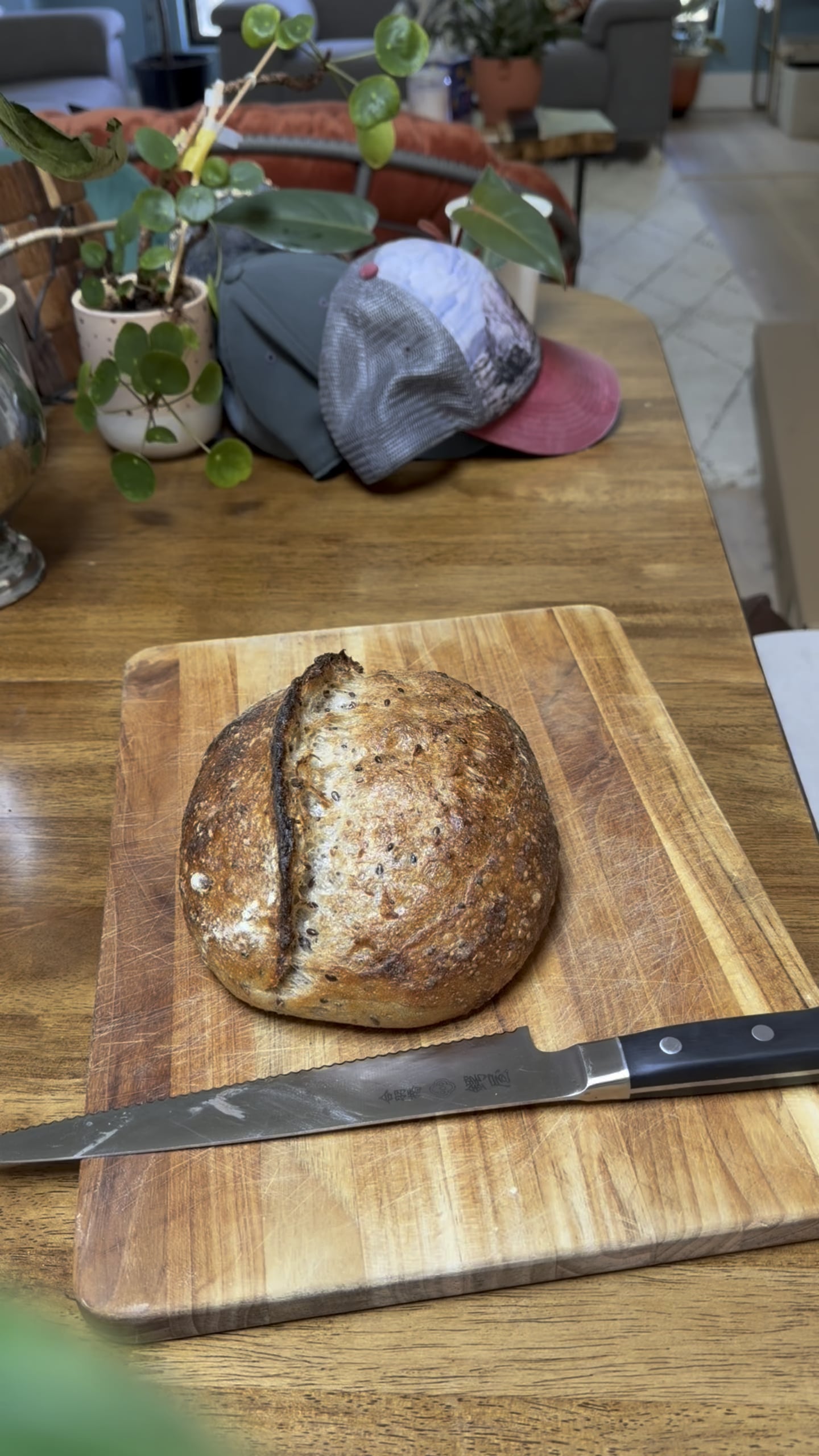 Crumb was not too wild on this one but still soft and squishy. High hydration dough that I slapped around way more than normal and I think I could feel the gluten development; it was easy to work with as a result. Seeds and honey continues to be my favorite flavor combination for sourdough. I want to figure out how to get my loaves to be more vertical! They have great oven spring but they only spring sideways lol.