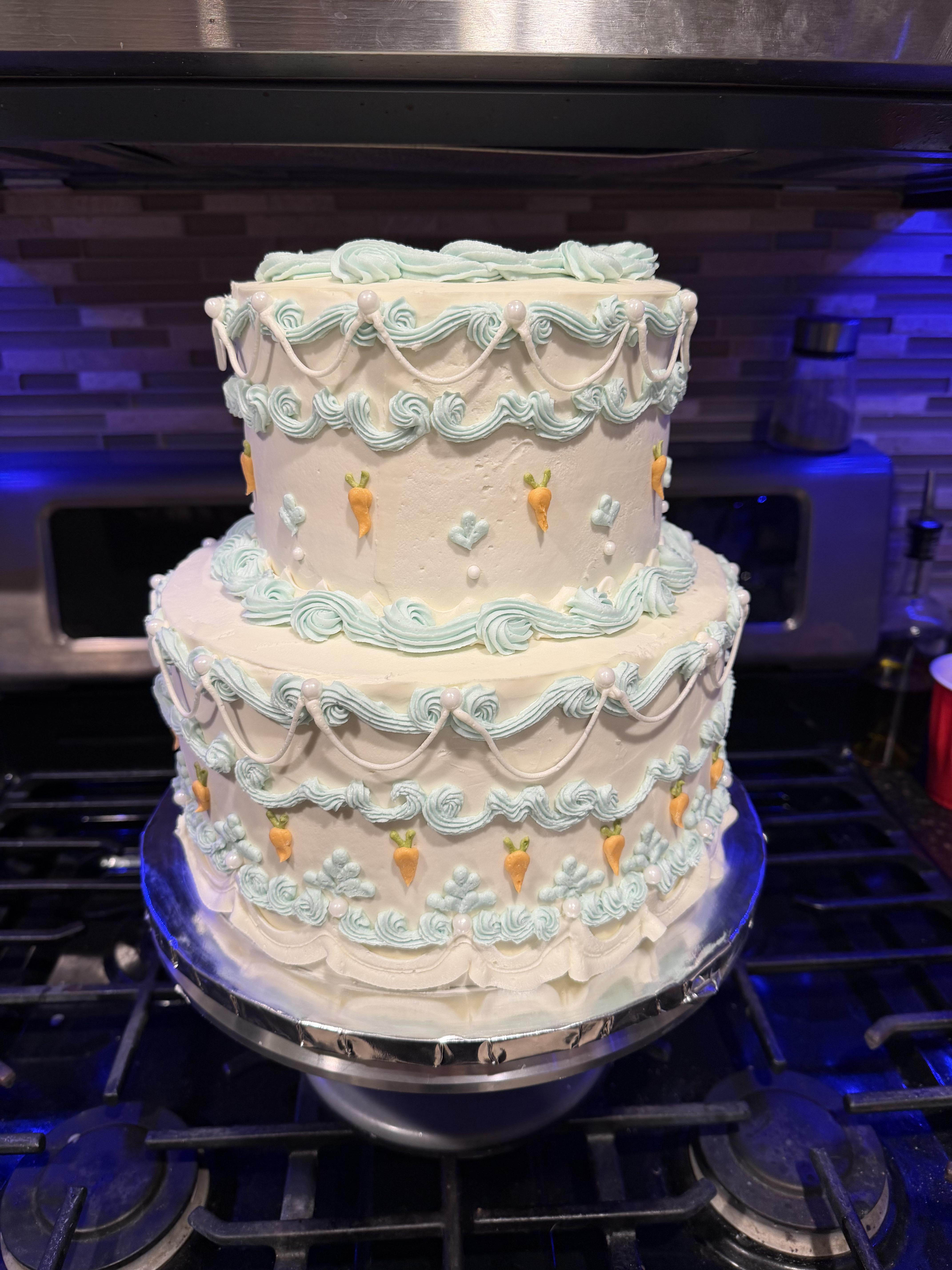 I’m happy with it but I know there’s room for improvement cause it’s just my eye looking for flaws. Everyone I’ve sent it to says it’s great. by ETsMomma 11 Comments salsichinha_1974 12 hours ago So beautiful. Bacm88 12 hours ago This is so gorgeous!!! NewbieMaleStr8isBack 12 hours ago so cute and well done cl0udpleasr 12 hours ago It’s so charming!! Those drop lines take serious talent 😅 FunDivertissement 11 hours ago It beautifully done but I wouldn’t have guessed Peter Rabbit. I thought it was a carrot cake. Needs cute bunnies. Annual-Education3230 11 hours ago Super cute, I hope it’s carrot cake❤️ Prestigious_Pair5563 10 hours ago Love it! Buttaflilove 9 hours ago Lovely 😊 leila-lovely 8 hours ago what a beautiful creation <3 WillingnessOrganic10 7 hours ago Beautiful! valerierosati 6 hours ago The little carrots are such a sweet touch, they make it feel so classic and cozy.