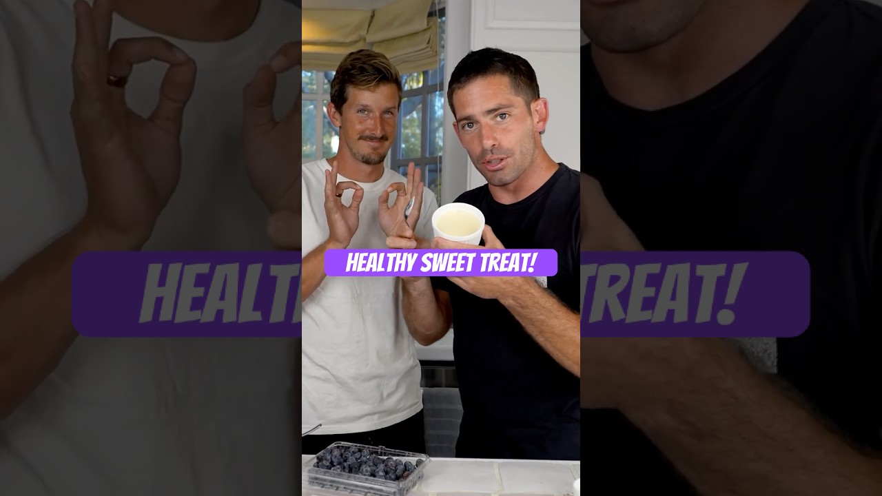 If you want a sweet treat that has some jiggle to it and it’s made with four natural ingredients, also has skin benefits, gut benefits, you need to know how to make panakot. Let me show you how right now. The first step for this panakota is you take a/2 cup of milk. You’re going to pour this into a bowl. Into that bowl is going to go 2 and 1/2 teaspoon of unflavored gelatin. It has to be gelatin powder. So, we’re going to go one teaspoon right here. Sprinkle it in there. Another teaspoon. And then a half a teaspoon. Gelatin has a lot of benefits for your gut, your skin. Now in a saucepan, you’re going to throw another 1/2 cup of milk in there. Also in that saucepan, 1 and 1/2 cups of heavy cream. I’m going with the Strauss right here. 1 and 1/2 cups. Boom. 1 and 1/2 cups. Pour that in there. And now to sweeten maple syrup. We’re going to go 1/3 cup of maple syrup. Pour that into the saucepan as well for the panakota. Throw this on like a medium medium heat. Oh, also in here, a little splash of vanilla extract. Boom. Just like that. We’re going to stir this up a little bit. And you want this to get to like a simmer. Now, we realized we made a little bit of a mistake. You’re supposed to pour this after it gets to a simmer into here, but that’s way too much. So, we’re going to pour this into a bigger bowl. Boom. That’s just the milk and gelatin. All right, we got this thing bubbling a little bit. And now, what we need to do is pour it into here. And this will dissolve that gelatin mixture. Boom. Pour all that into there for the panakota. I had a panakakota in Italy and it was so good. So that’s why I’m whipping this up. And now we’re going to pour it into a bunch of ramachins. How am I going to do this? I’m going to pour it back in the measuring cup which just has some maple syrup in there. And then pour it in there. That worked. That was smart. Oh yeah, it smells so good. Okay, now these go in the fridge for 4 hours. And now, oh, the recipe is ready. All the work has been done. And look who shows up. Oh, okay. So Austin’s salivating, but you have to hear the history of panakota. So it’s traced back to northern Italy. And when you add eggs, which we should do next time, some egg yolks just, you know, raise up the nutrition that makes it a custard. Let’s add a little blueberries. Got that jiggle up. Yeah, you like that. Cheers, man. Panakakota. Oh yeah. Just like pudding texture. Wo, that’s so fire, dude. This is This is fire. This is so fire, bro. Oh my goodness. Of course. Another healthy sweet treat. Follow me for more, guys, because I post healthy recipes every single week to keep you dialed in. Let’s go.