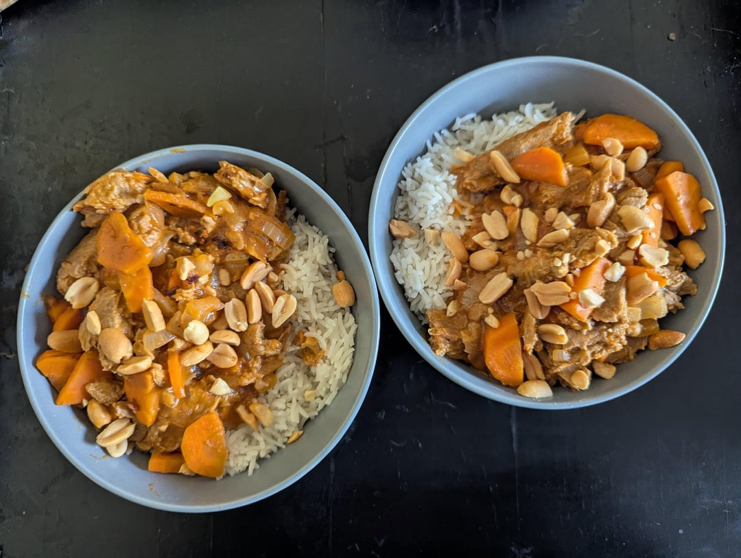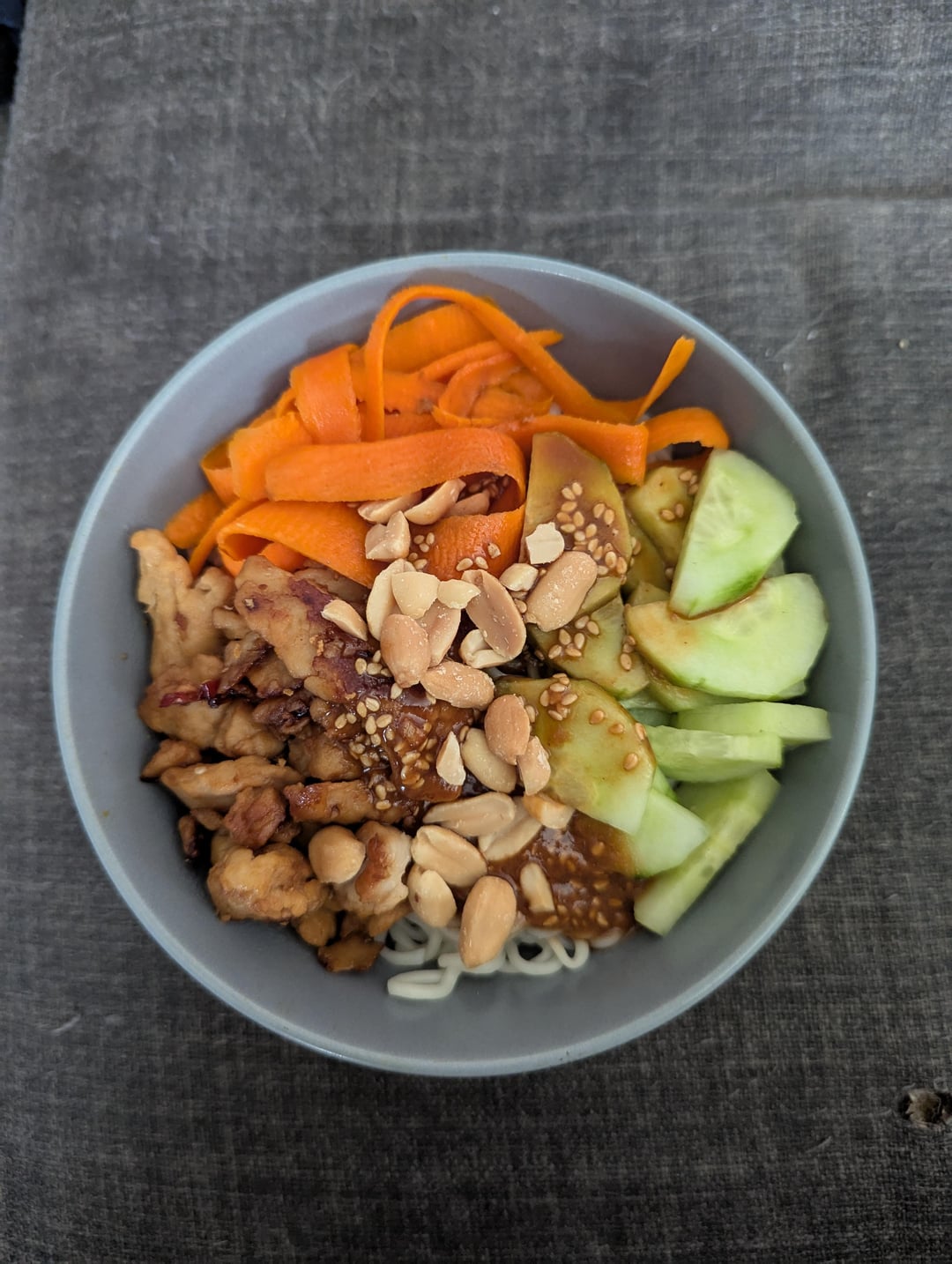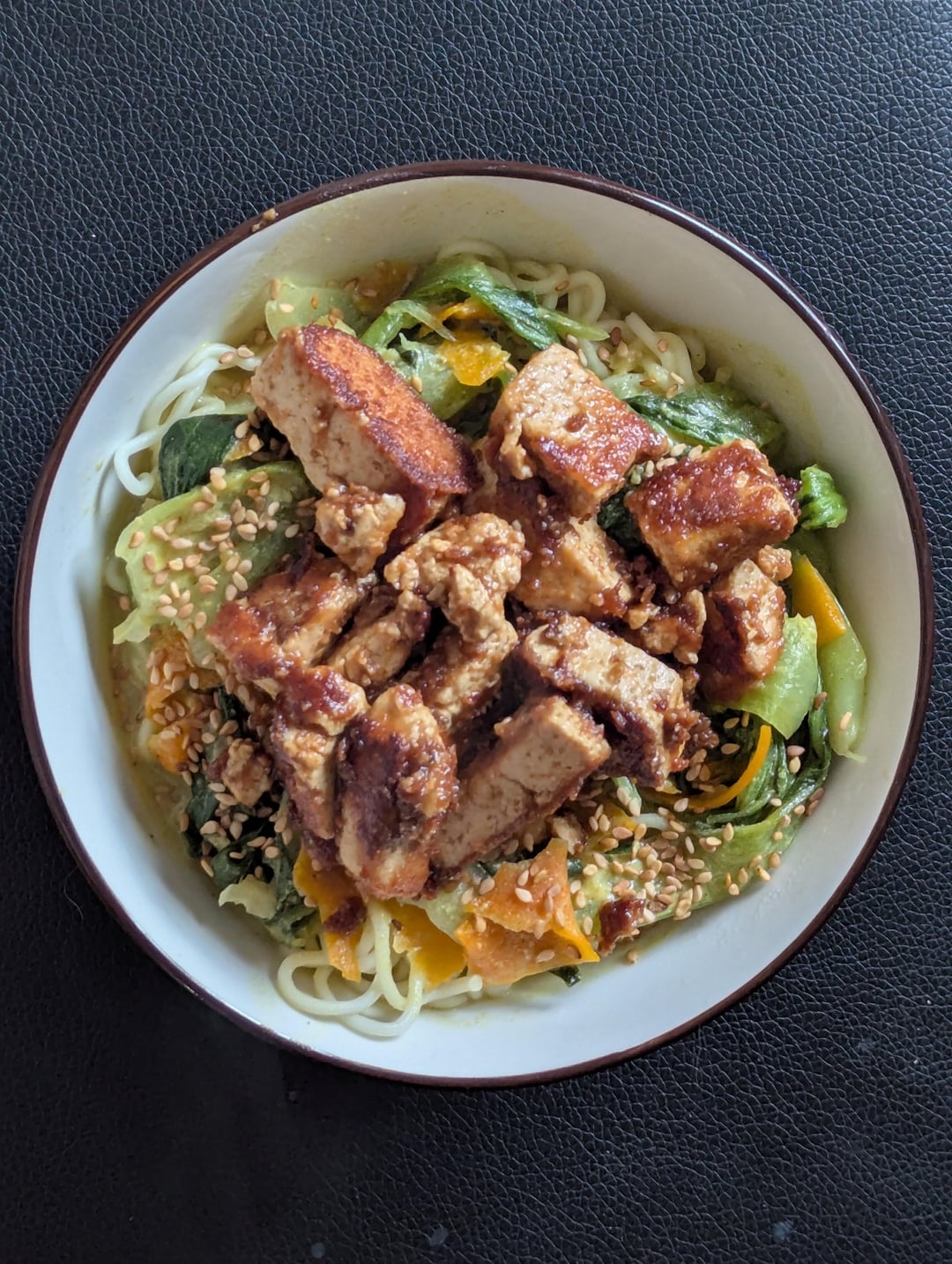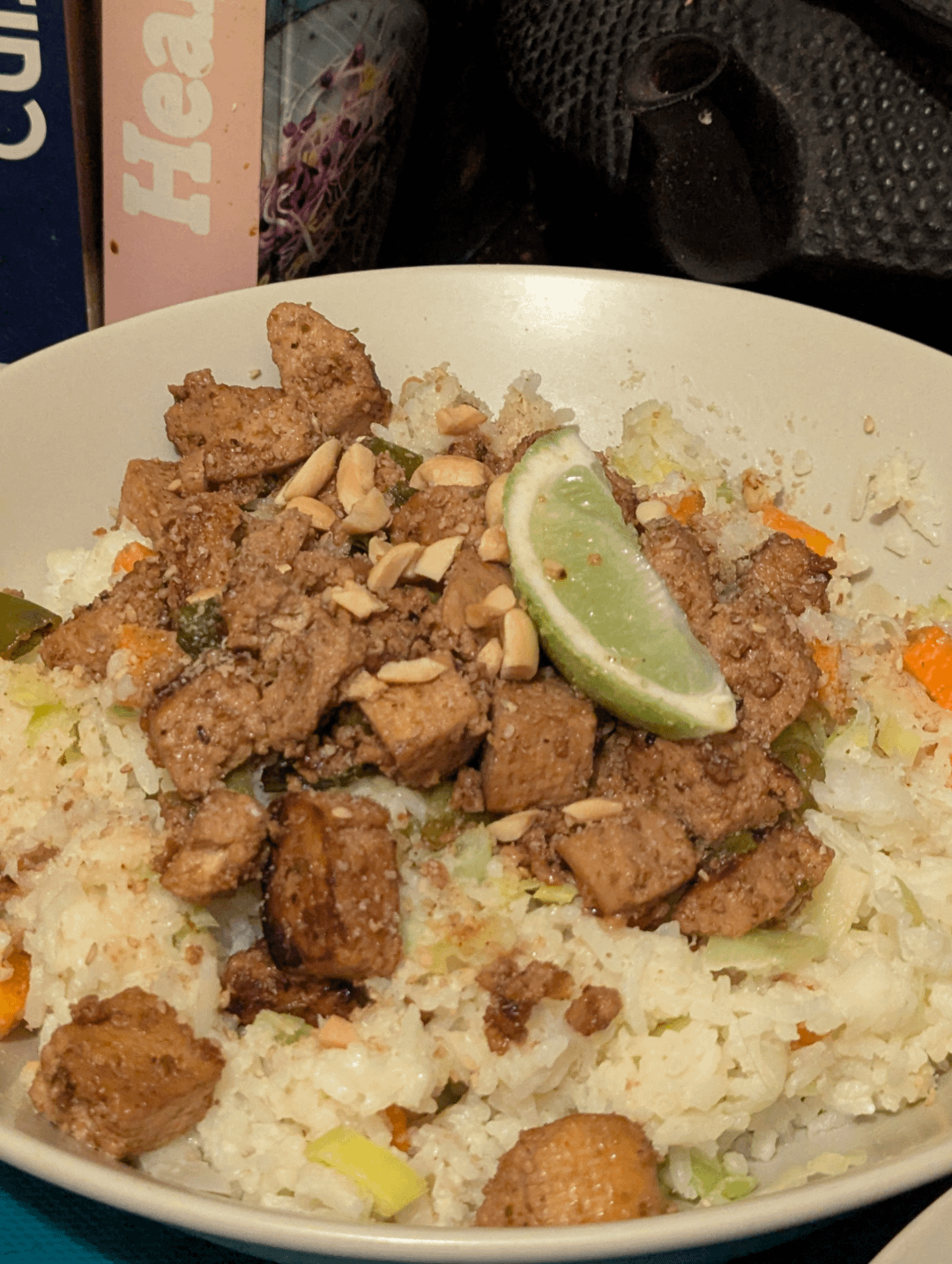 17- grilled tofu with a satay sauce and its rice and veggies cooked in coconut milk.