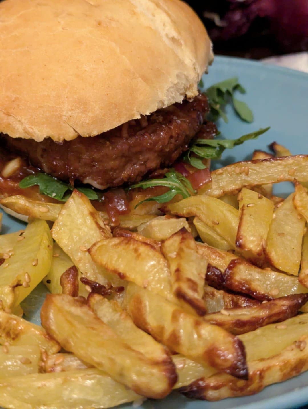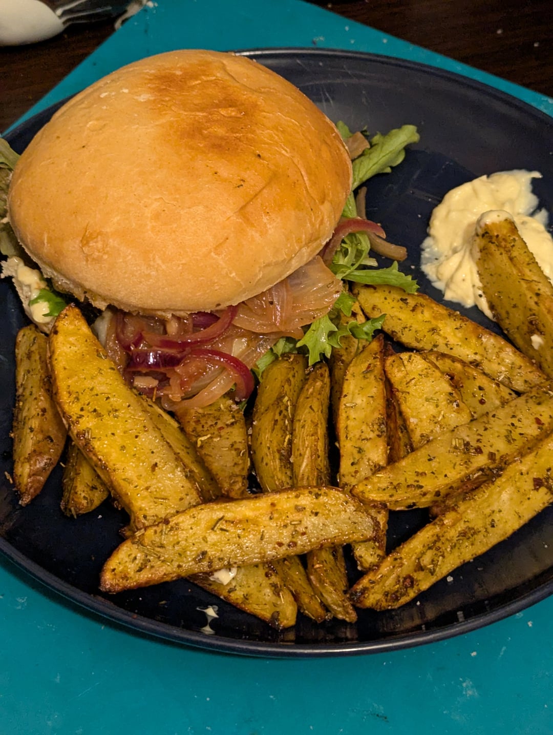 8- Aioli and portobello mushroom burger and potato wedges with herbs