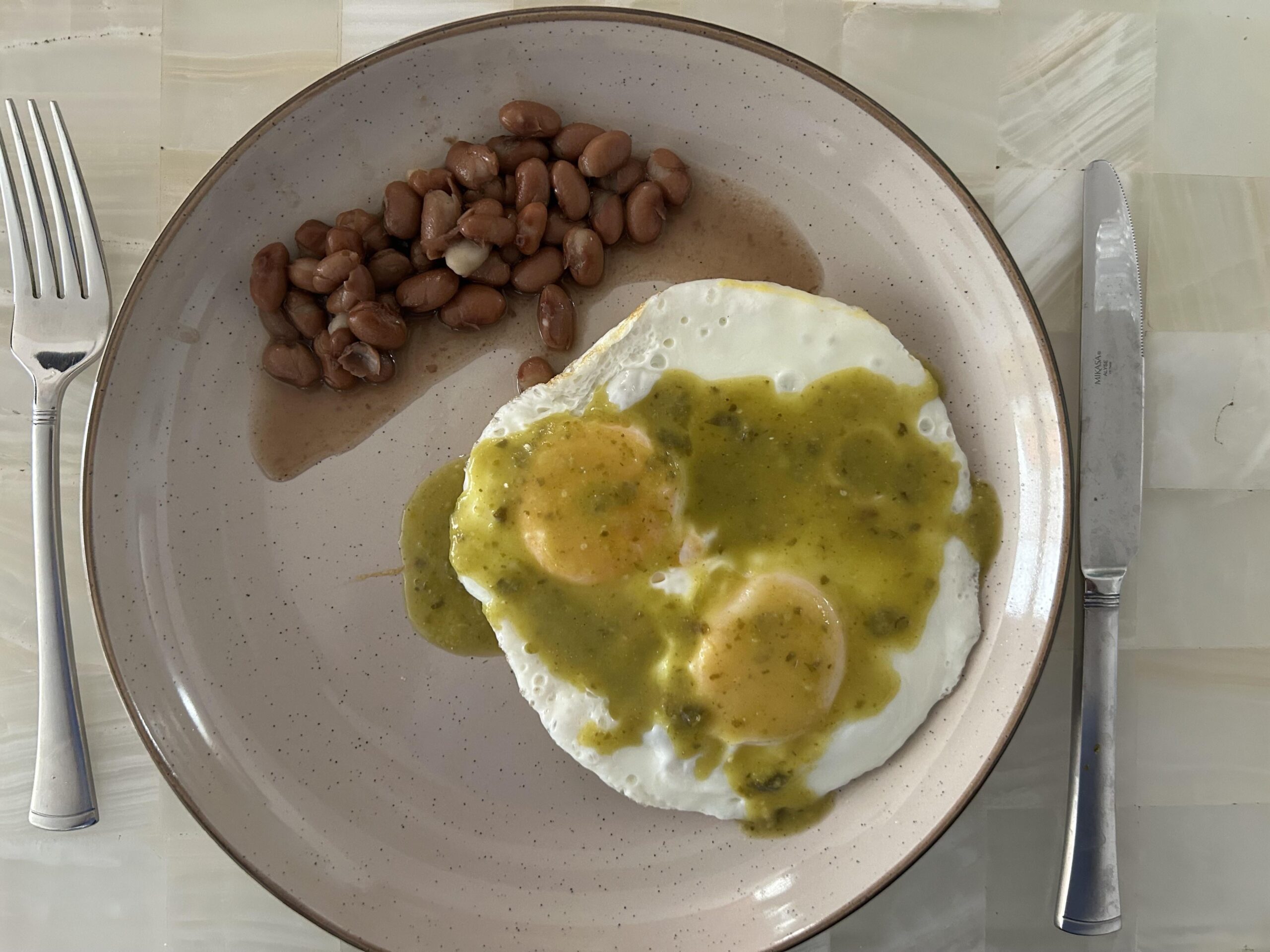 – long: Huevos estrellados en salsa verde, con frijoles bayos enteros