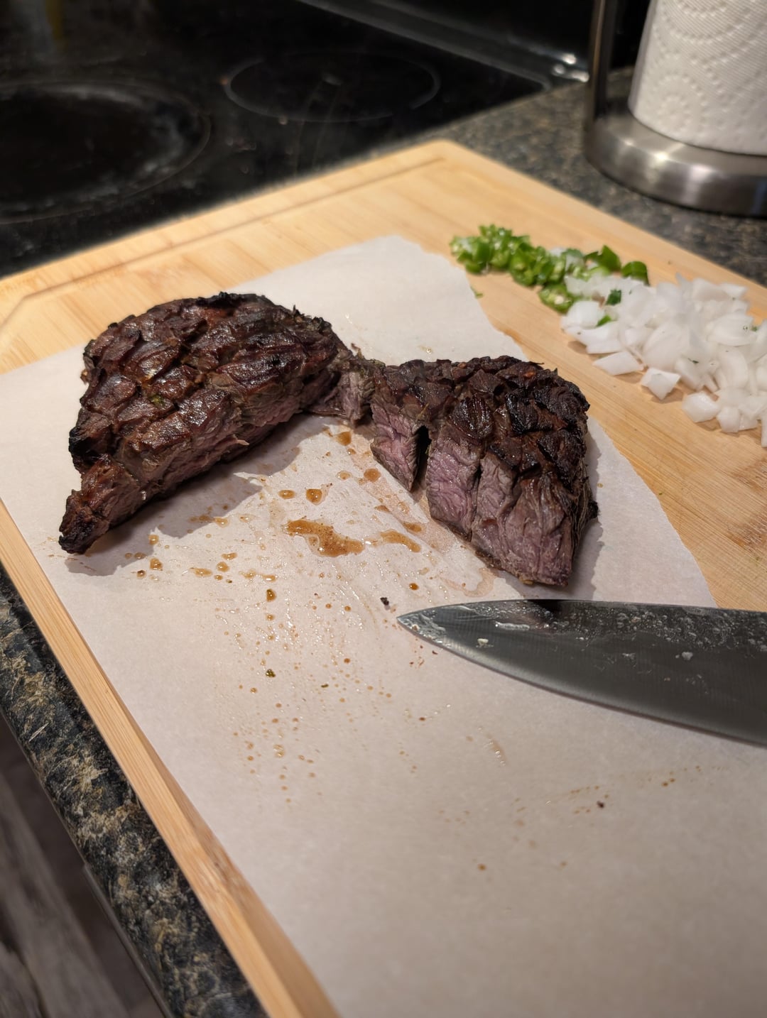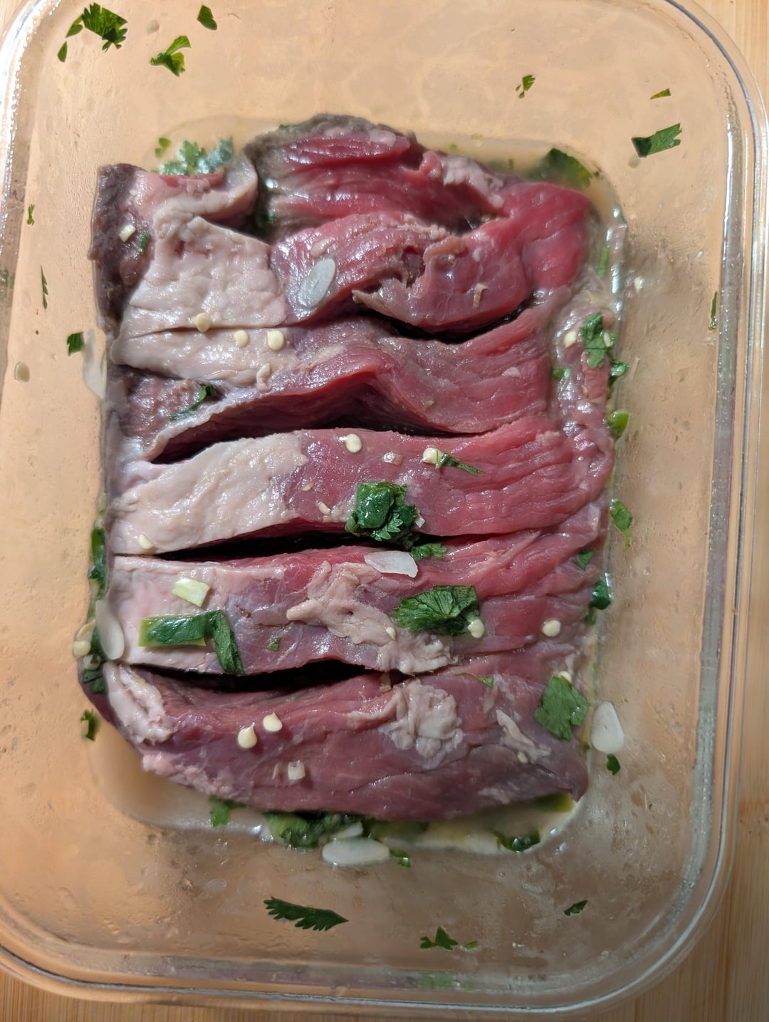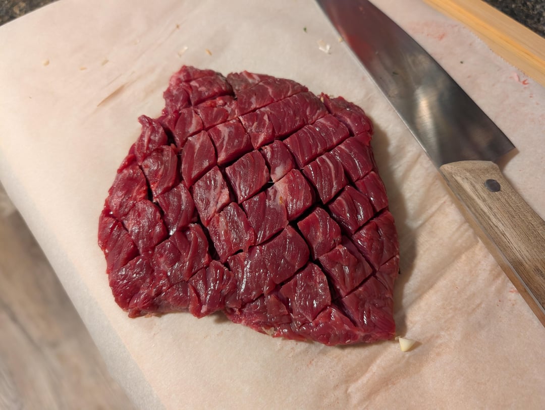 ive refined the approach, ya see. i splurged with the limon juice this time around for the marinade. i was stingy last time. used more garlic, a bit more salt and used a larger container to marinade in so the meat is flat. i cut "breathing holes" through the meat and cross-hatched the mating surface.