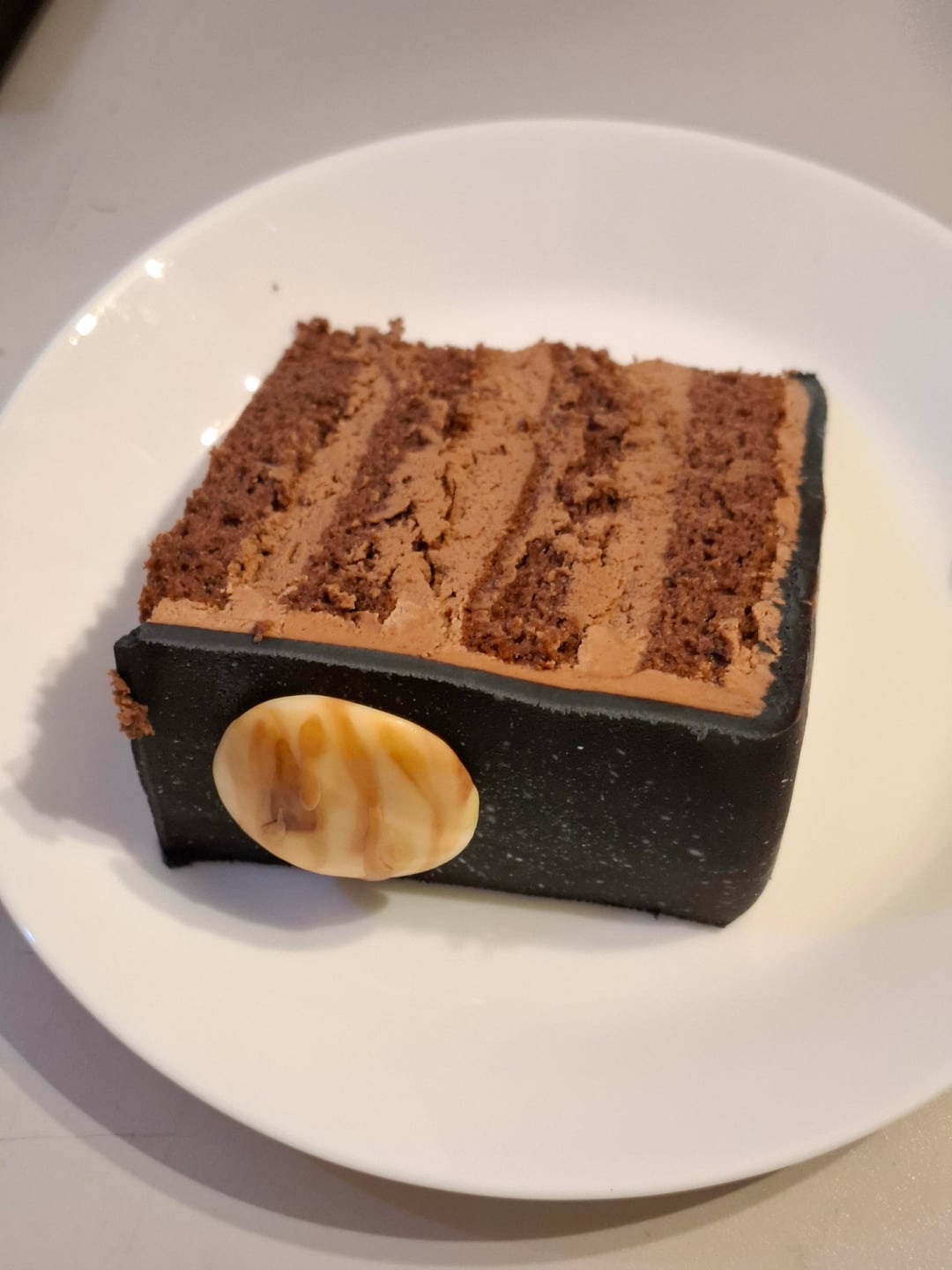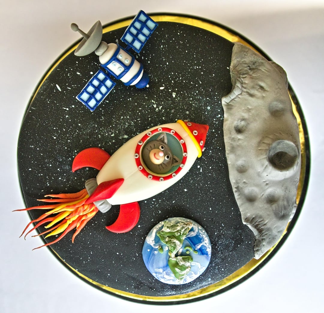 Made by my partner. ๐Ÿ™‚ Chocolate filling and sponge. Fondant cover, with swiss butter cream. All decorations are edible and handmade. (The Szamos cat head is copied from a real Szamos marzipan cat, as it's a cake series from the cat's adventures ๐Ÿ˜€ )