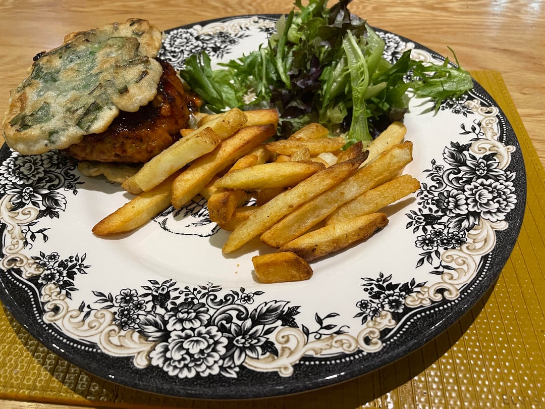 Home made pork, tofu and mushroom burgers with a gochujang glaze, fried egg for the extra hungry husband, chive jeon ‘burger bun’ with a few fries and salad.