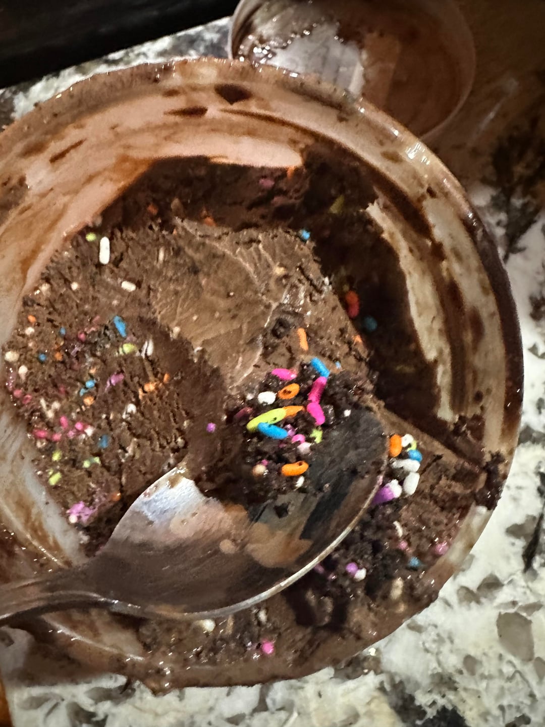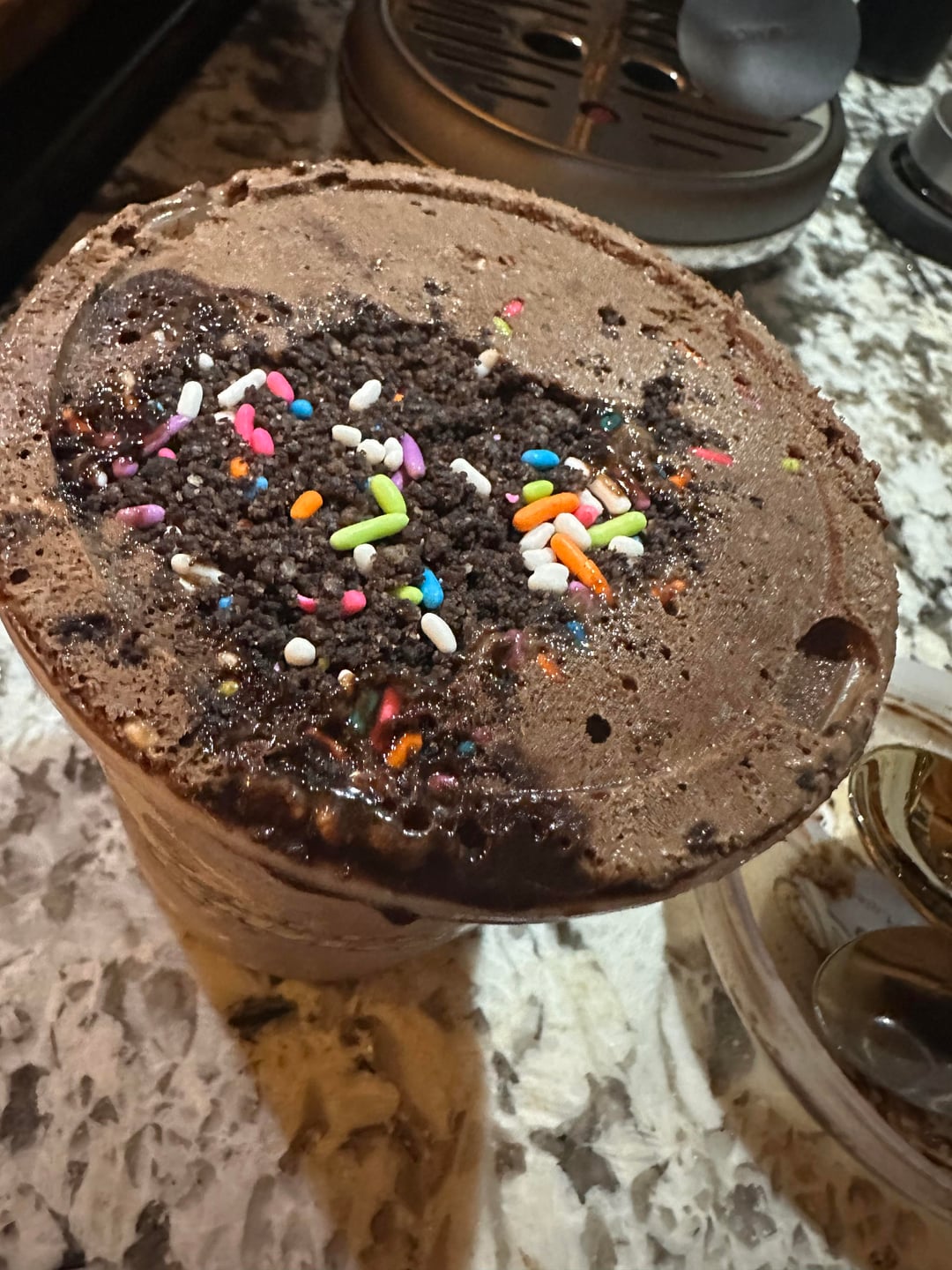 Chocolate ice cream with fudge, Oreo brittle and rainbow sprinkles. It was very good and had a lot of sprinkles, more than probably any other ice cream I’ve had