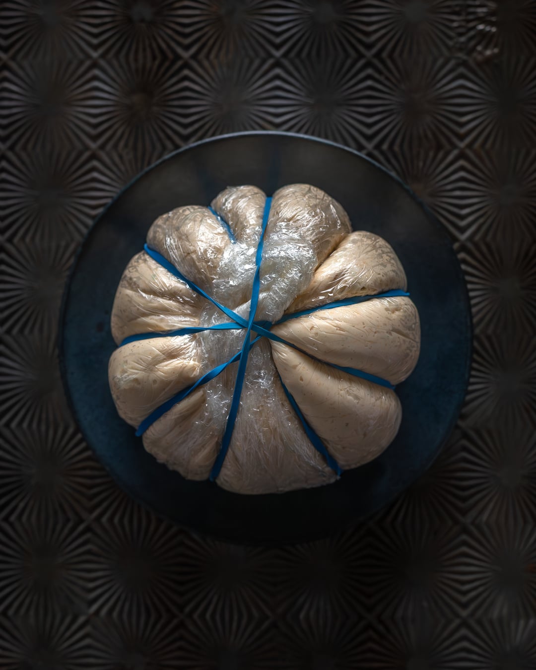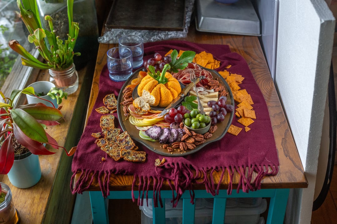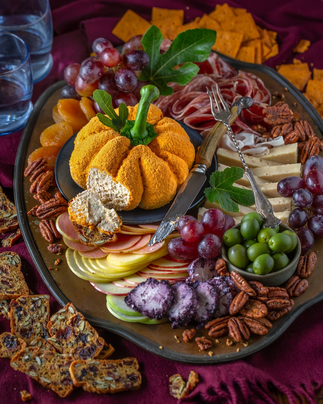 A savory and sweet cheddar and apple cheeseball that I shaped to look like a pumpkin by wrapping it in saran wrap and securing it with rubber bands while it set. I used a bell pepper stem and fig leaf for the top. The outside is dusted with cheddar powder. Served with an assortment of fruits (a few varieties of sliced apples, grapes, dried apricots, olives), candied sweet and spicy pecans, meats (prosciutto, coppa, sopressa), and a couple other cheeses (goat cheese with blueberry and caramelized onion cheddar) as well as some gluten-free crackers. I also included a how it was photographed so you can see it’s on a scarf for the background set on a little table by a window with a foam board as a reflector to add some light back to the darker side of the food.