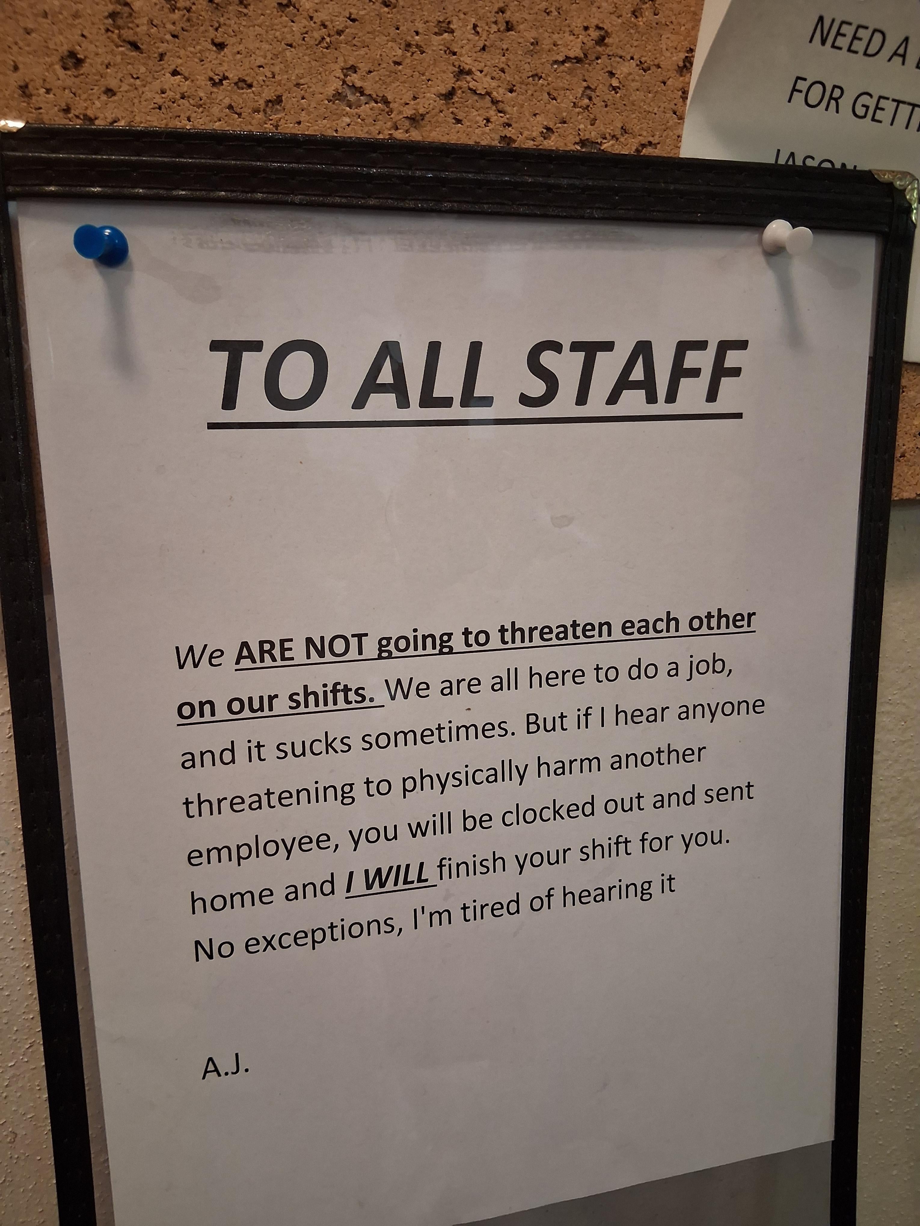Wait, doesn’t his mean if you all threaten each other with violence you all get the night off to go party and your manager has to cover all your shifts?