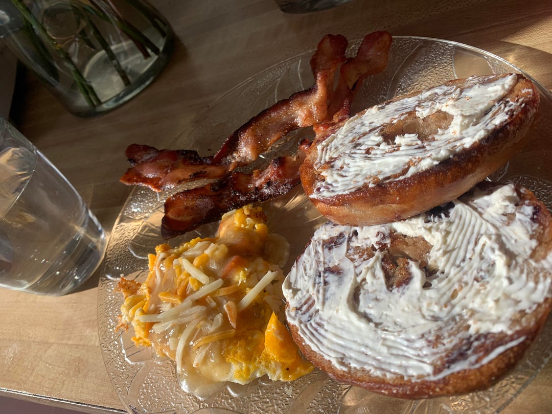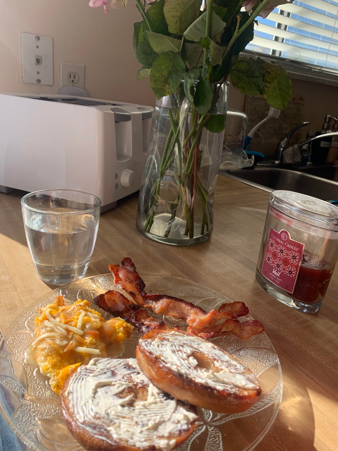 Store bought green chile was 👌🏽, should have smothered the plate in it 😋. Plus I toasted the bagel in the same pan as the bacon so it had a tinge of bacon taste 😩.