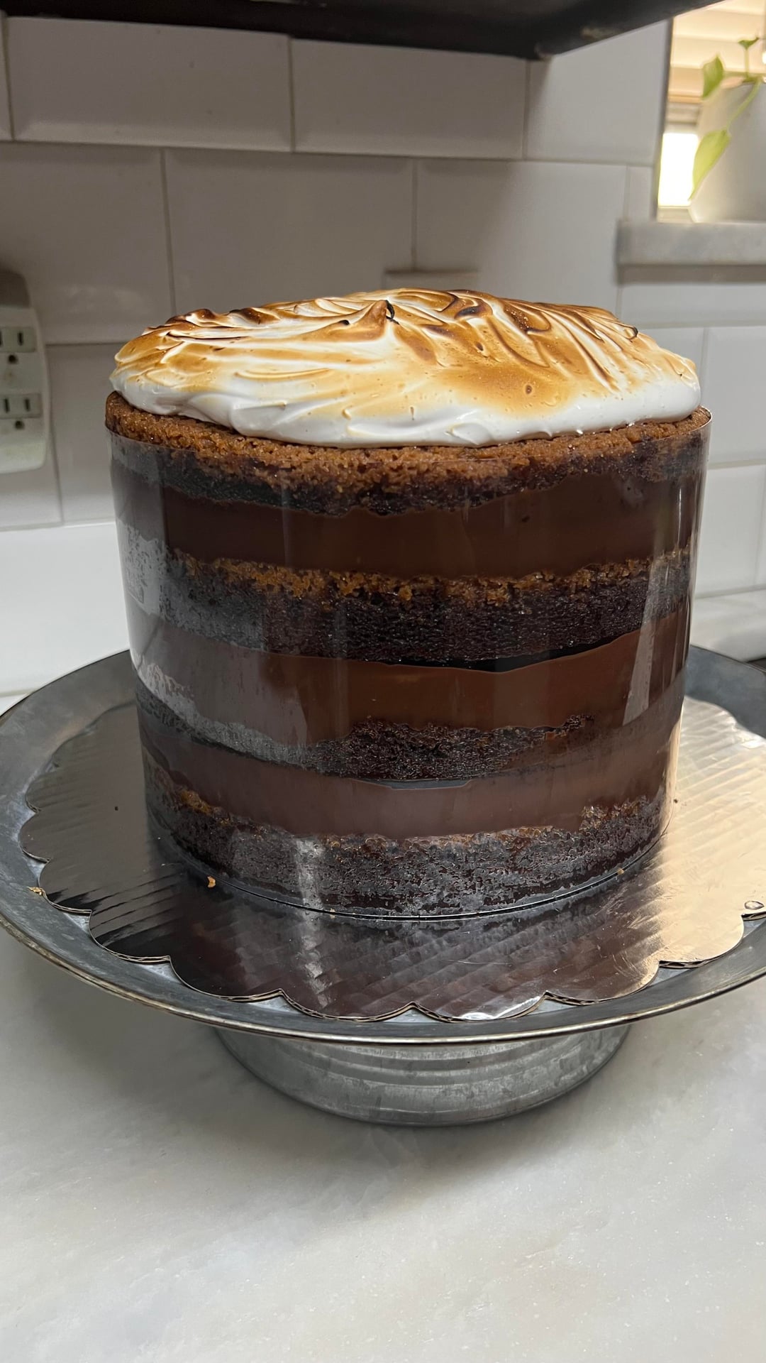 •graham cracker base baked for 8 mins @350F prior to adding the chocolate cake batter (1/4 cup sugar, 1/2 teaspoon salt, 3/4 cups of butter, 2.5 ish cups of graham crackers crushed which is roughly 15 large graham crackers- this recipe is for 2 cake layers 8 inches in diameter, you have to double it for this large cake size) press down the base to make it as flat as possible.