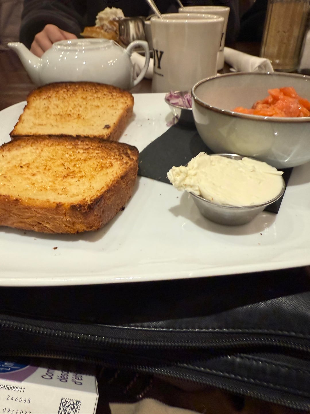 Butter on toast is simple but hits every time!!!! So it’s 2 slices of white ploughman bread (190-230) with 2 pats of butter (140), maybe 100g smoked salmon (100-120), onions (5), and ~2.5-3 oz cream cheese whipped which is lower than regular cream cheese (150-170) = 650-750 kcal is my guess 🙂