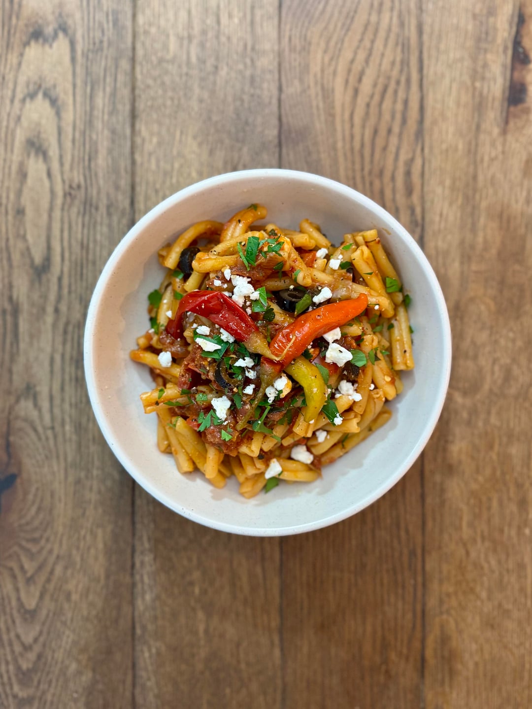 I made arguably my best ever Shakshuka for breakfast. With the tiny amount left over, I styled it into a caponata-like pasta dish for dinner: I added some pickled peppers and black olives, tossed in some feta, and topped with EVOO and more peppers. Obviously a pretty far cry from a traditional caponata given the base spices, but it came out amazing.